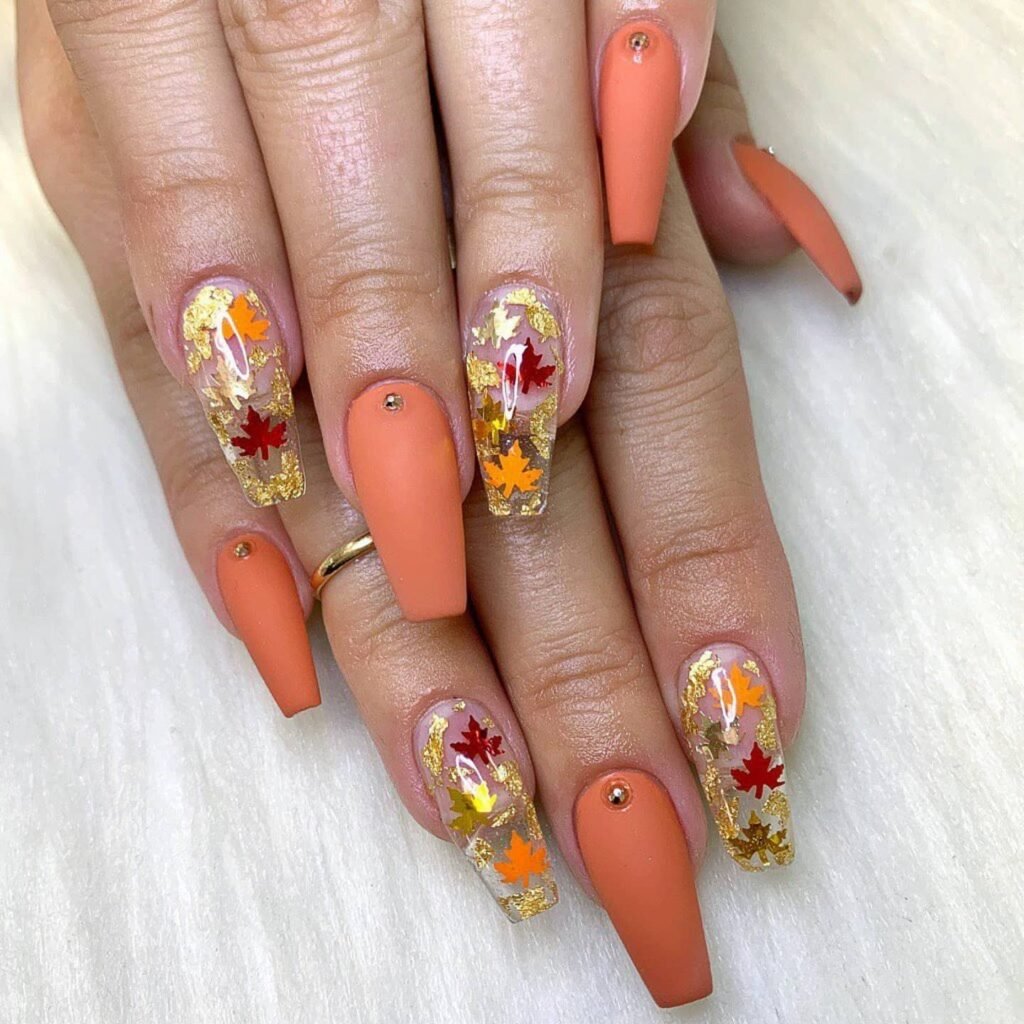 These elegant fall-inspired nails feature a combination of matte orange polish and clear tips adorned with delicate leaf designs in red, yellow, and gold, creating a vibrant autumn look. The addition of rhinestones adds a touch of sparkle, making these nails both trendy and seasonal.