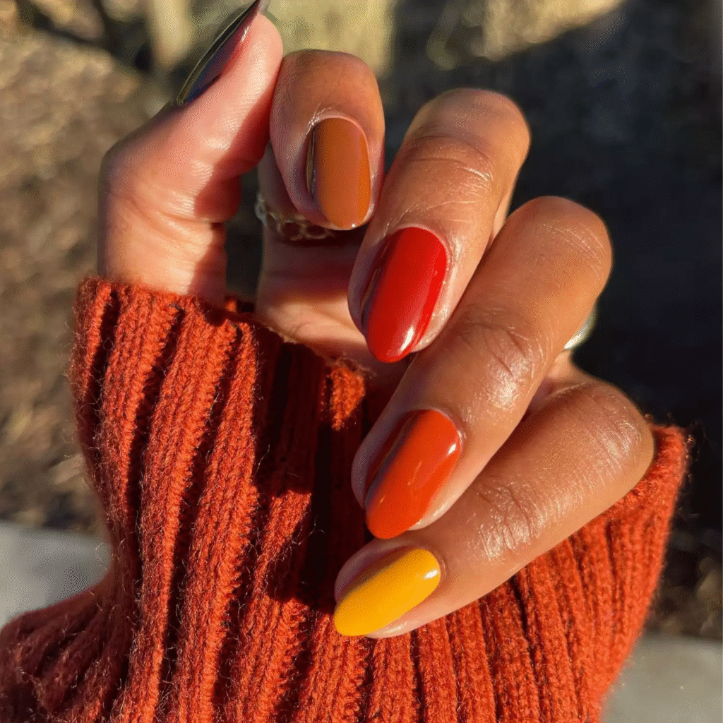 Not into detailed nail art? No problem! Choose a tonal design with shades of orange, brown, red, and yellow. These warm colors instantly remind you of fall leaves without the need for intricate designs. It’s a quick and easy way to embrace the season’s colors.