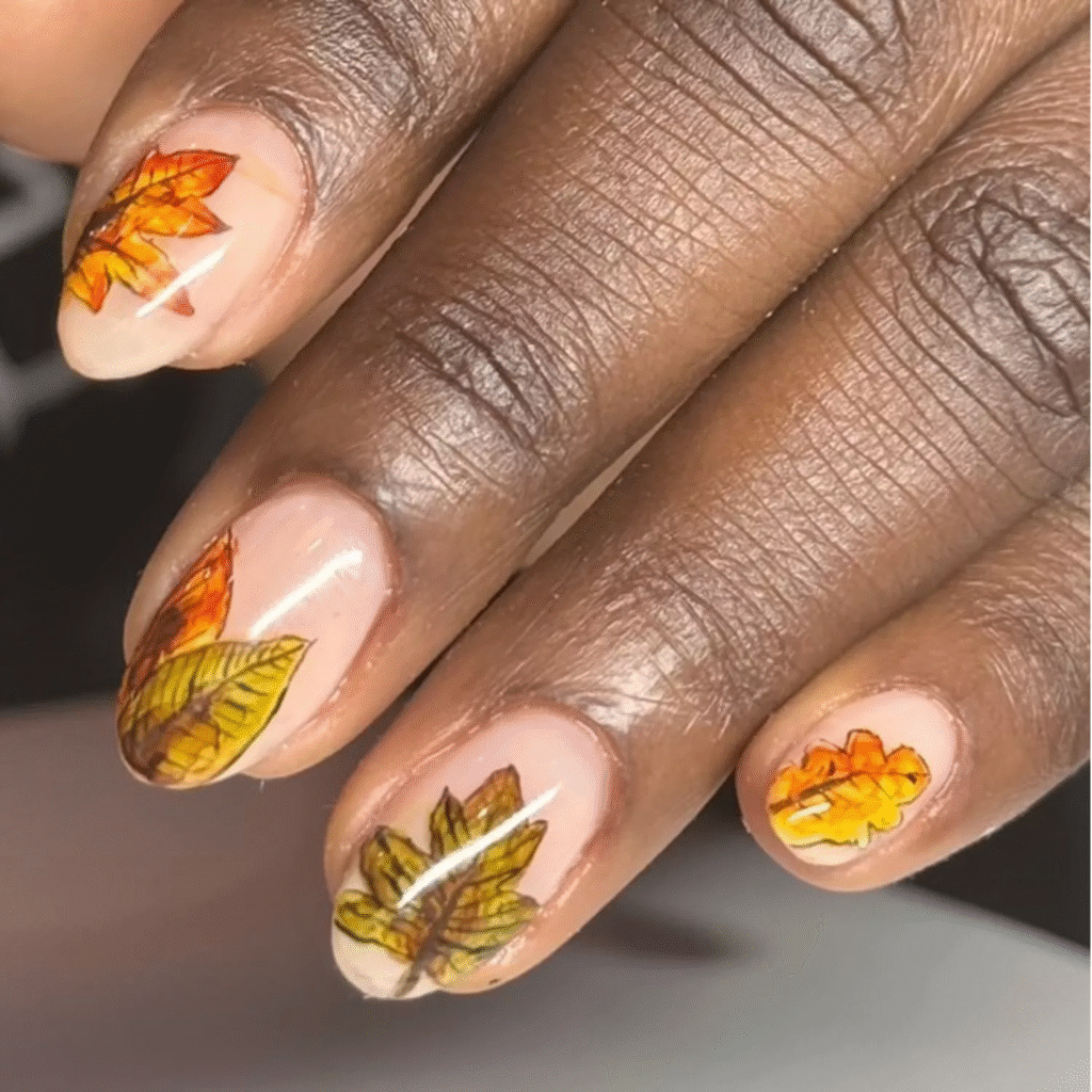 For a simpler, yet creative take on fall leaves, dried flower designs are perfect. Apply small pieces of dried leaves or flowers to your nails for a natural, earthy look. The colors of yellow, green, and orange, set on nude nails, give a perfect autumn feel with minimal effort.