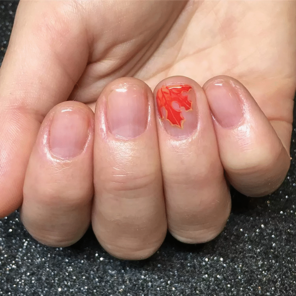 If you prefer minimalist designs, this simple, glossy nail art might be just for you. A natural nail base with a single orange maple leaf on the ring finger creates a subtle yet stunning fall-inspired manicure. It’s a perfect look for those who enjoy a clean, simple style.