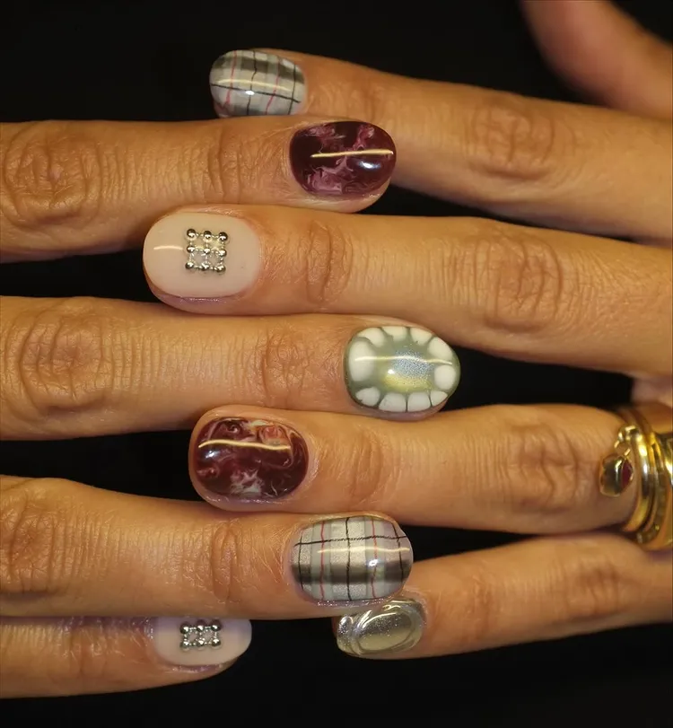 This short manicure mixes green cat-eye polish, plum marble, silver studs, and plaid. The rounded shape keeps the busy designs looking soft and neat.