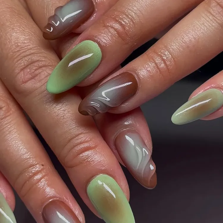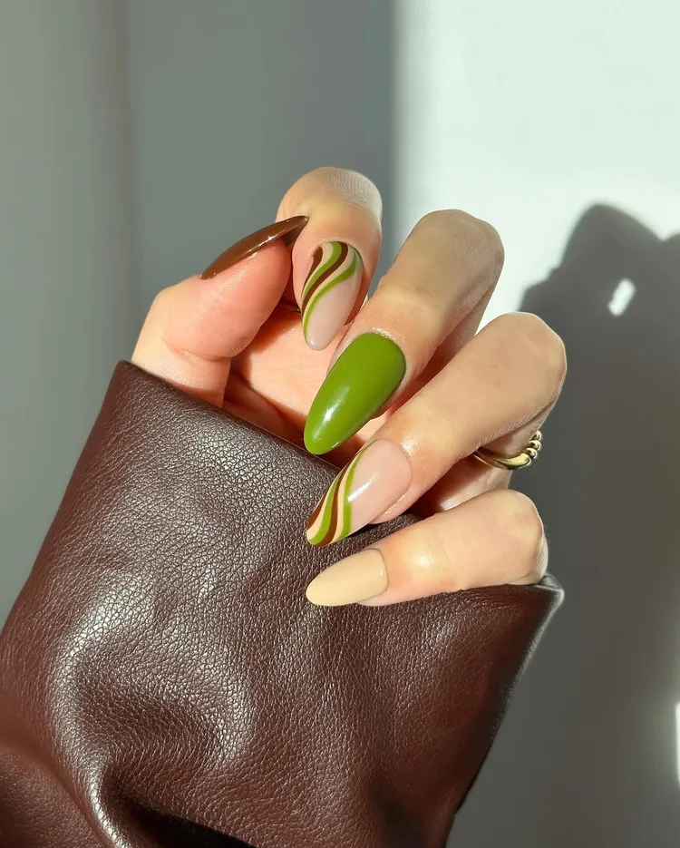 Green accents change a simple brown and nude manicure into something bold. Each color has warm tones, so the whole look feels balanced.