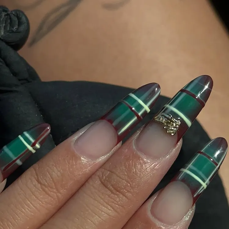 Plaid will be a big nail trend in winter 2025. This look uses a deep mahogany base with bright jade green lines. Gold teddy bear decals on the thumbs add a fun holiday touch.