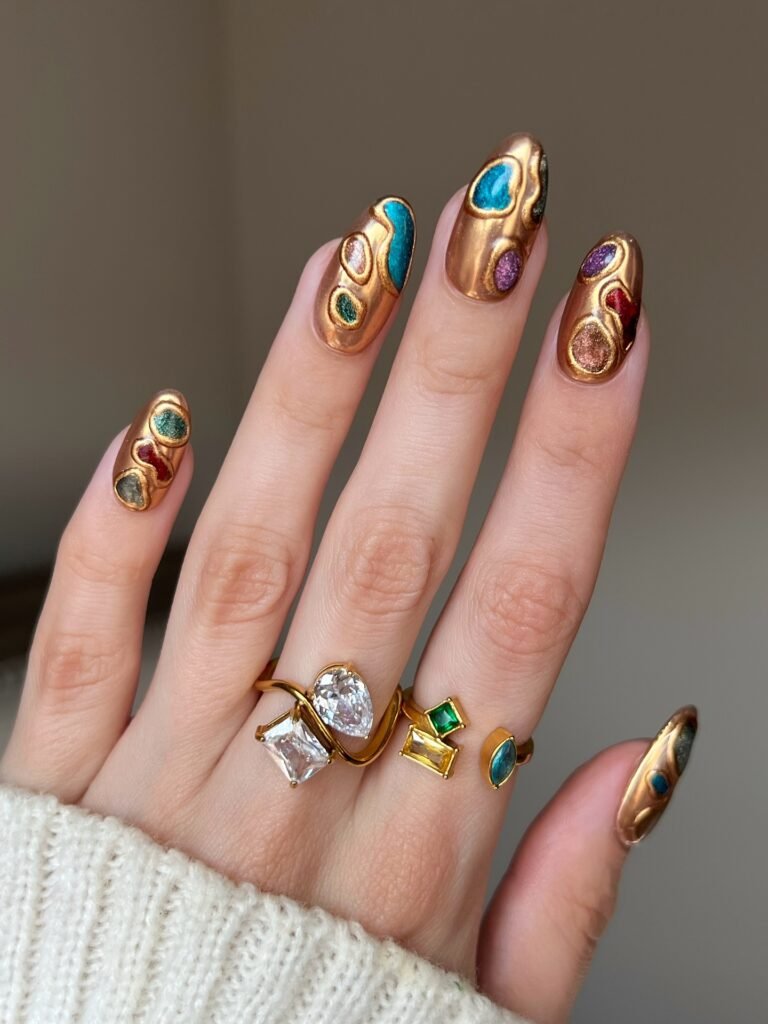 Jewel-toned nails, especially in shades of deep blues and emerald greens, give off an aura of luxury. These rich colors, along with shiny finishes, are perfect for women who want a touch of elegance without overdoing it. They’re ideal for dinners, parties, or any event where you want to shine.
