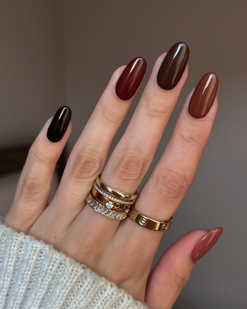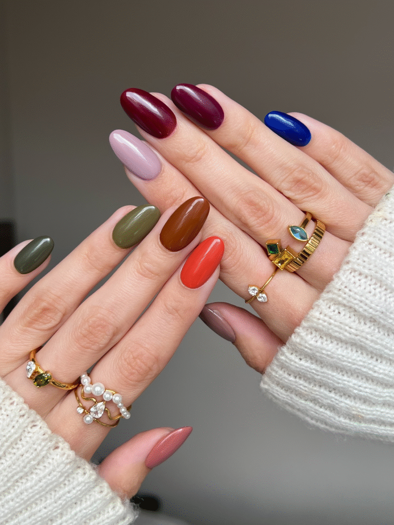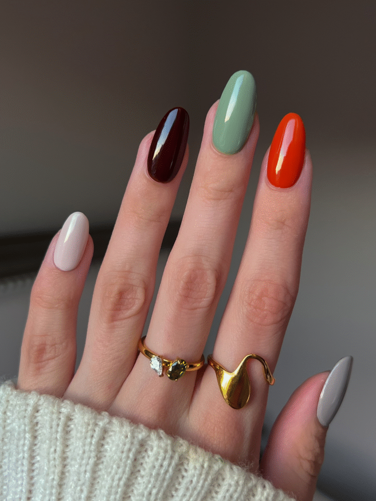 If you’re someone who can’t choose just one color, multicolor nails are the answer. Combining autumnal shades like brown, green, burgundy, and orange gives you the full fall experience. This vibrant style allows you to mix and match different hues, creating a custom look for every occasion.