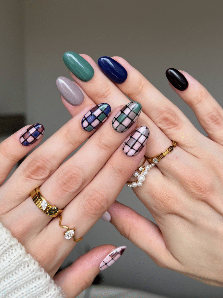Plaid patterns are not just for clothing! Adding a plaid design to your nails is an easy way to show off your love for autumn’s traditional aesthetic. These colors—green, purple, and black—bring a sophisticated vibe to your nails, making them perfect for both casual and formal occasions.