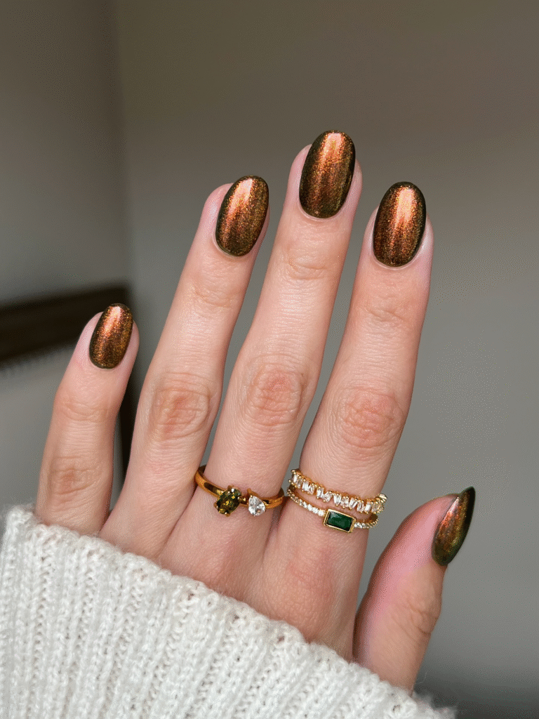 Fall is all about warm tones, and nothing says autumn like shimmery copper nails. The golden sparkle in these nails will catch the light and add a touch of glam to your outfit. It’s a perfect design for an elegant fall gathering or just to add some shimmer to your everyday look.