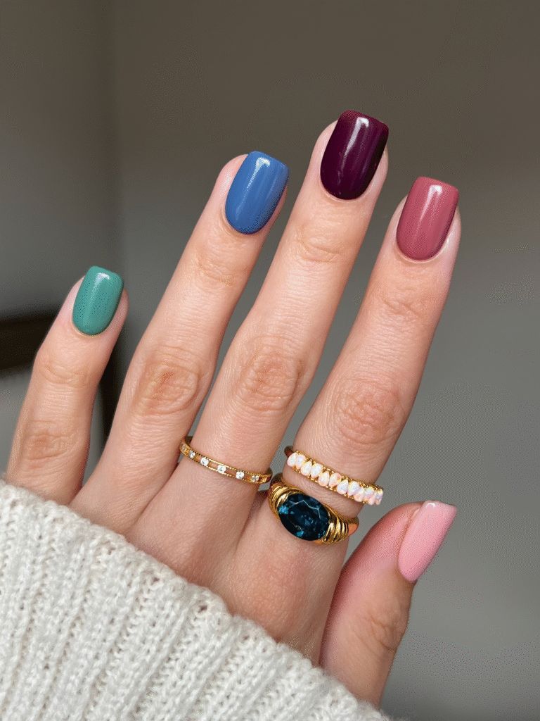 A mix of different shades like rich reds, greens, and browns perfectly captures the essence of fall. These nails have a lovely, understated charm and allow for a lot of creativity. You can change up the design by adding simple stripes, gradients, or a solid color for each nail.