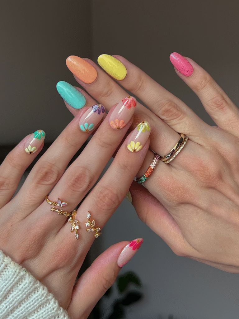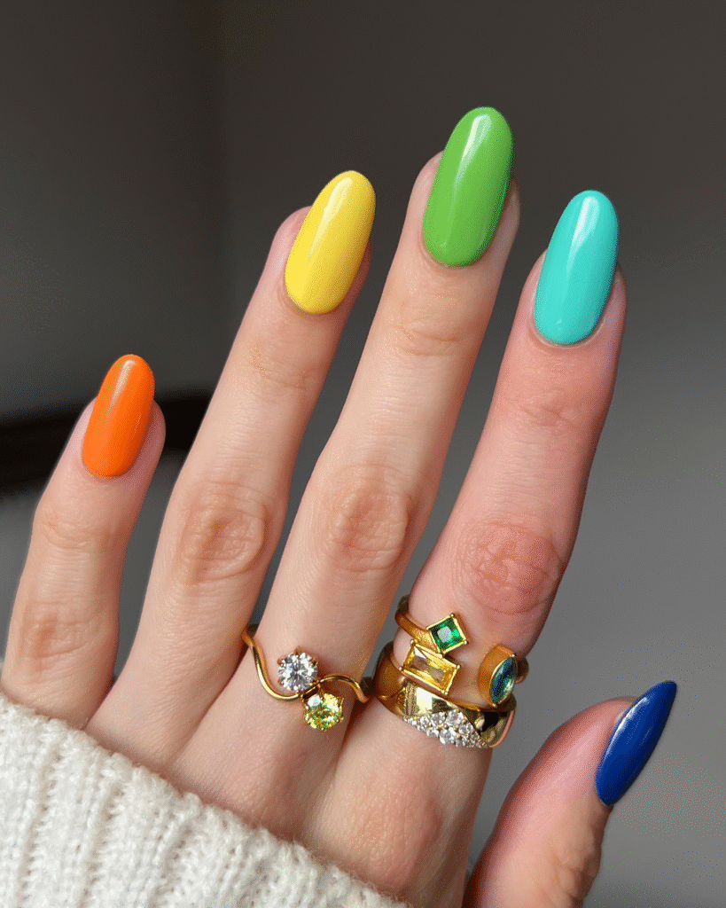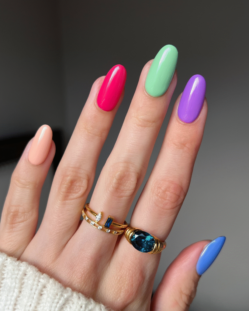 This design is a fun mix of bright colors like pink, green, purple, and blue. The shiny, bold colors stand out and give a fresh, energetic look. This style is ideal for women who love experimenting with multiple colors on one set of nails.