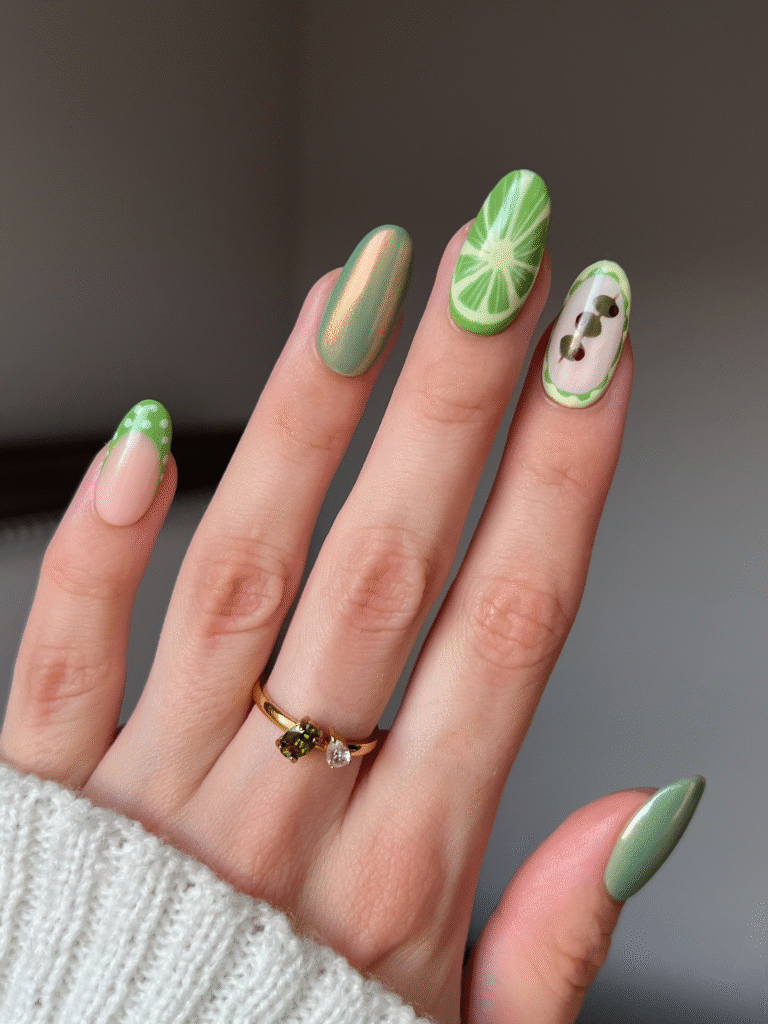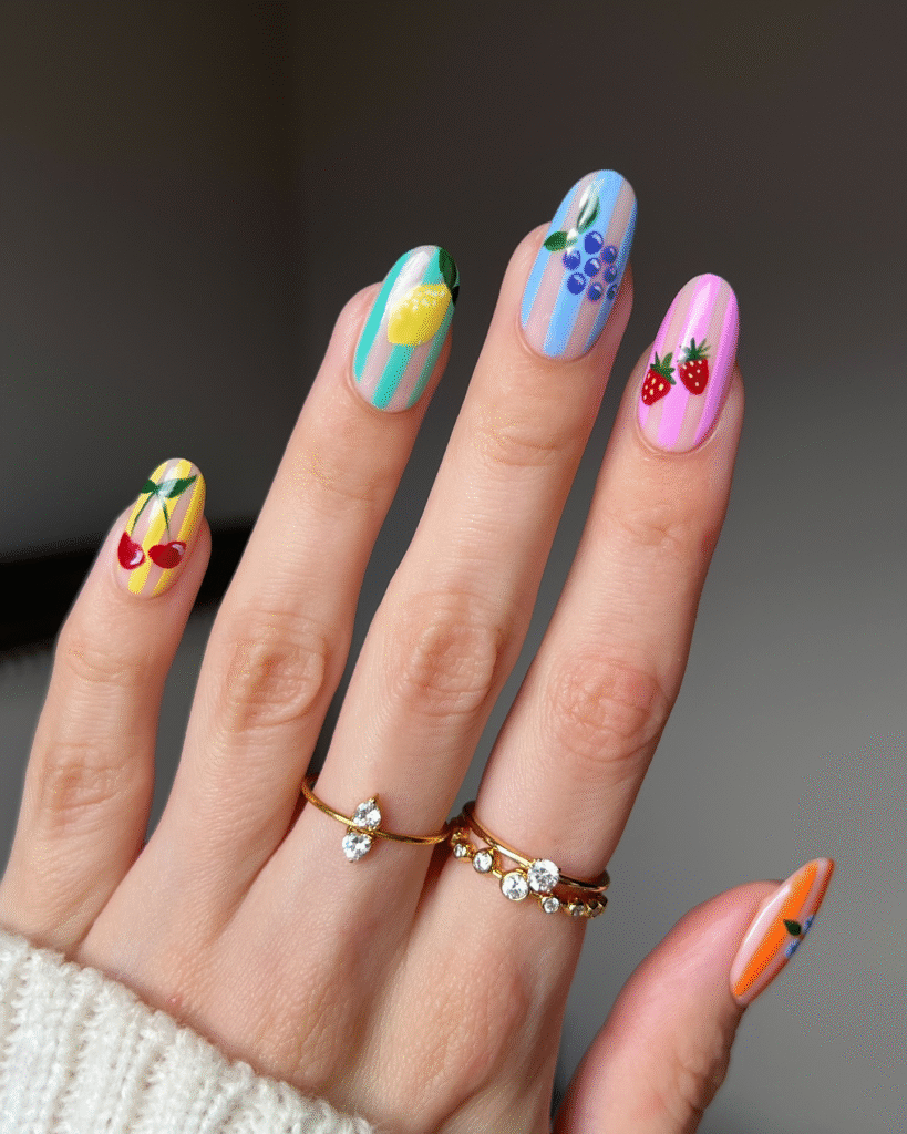 These nails combine playful stripes with fruit-themed designs. With lemons, cherries, grapes, and strawberries, this design brings a fruity and fresh touch to your nails. It’s vibrant, fun, and perfect for women who want to stand out with something different.