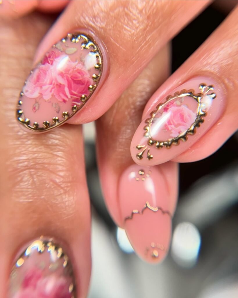 This beautiful manicure features soft pink hues with delicate floral designs encased in gold-framed details. The intricate gold outlines highlight the soft pastel base, creating a refined and luxurious look perfect for any occasion. The flowers inside the frames add a gentle, feminine touch to the overall design.