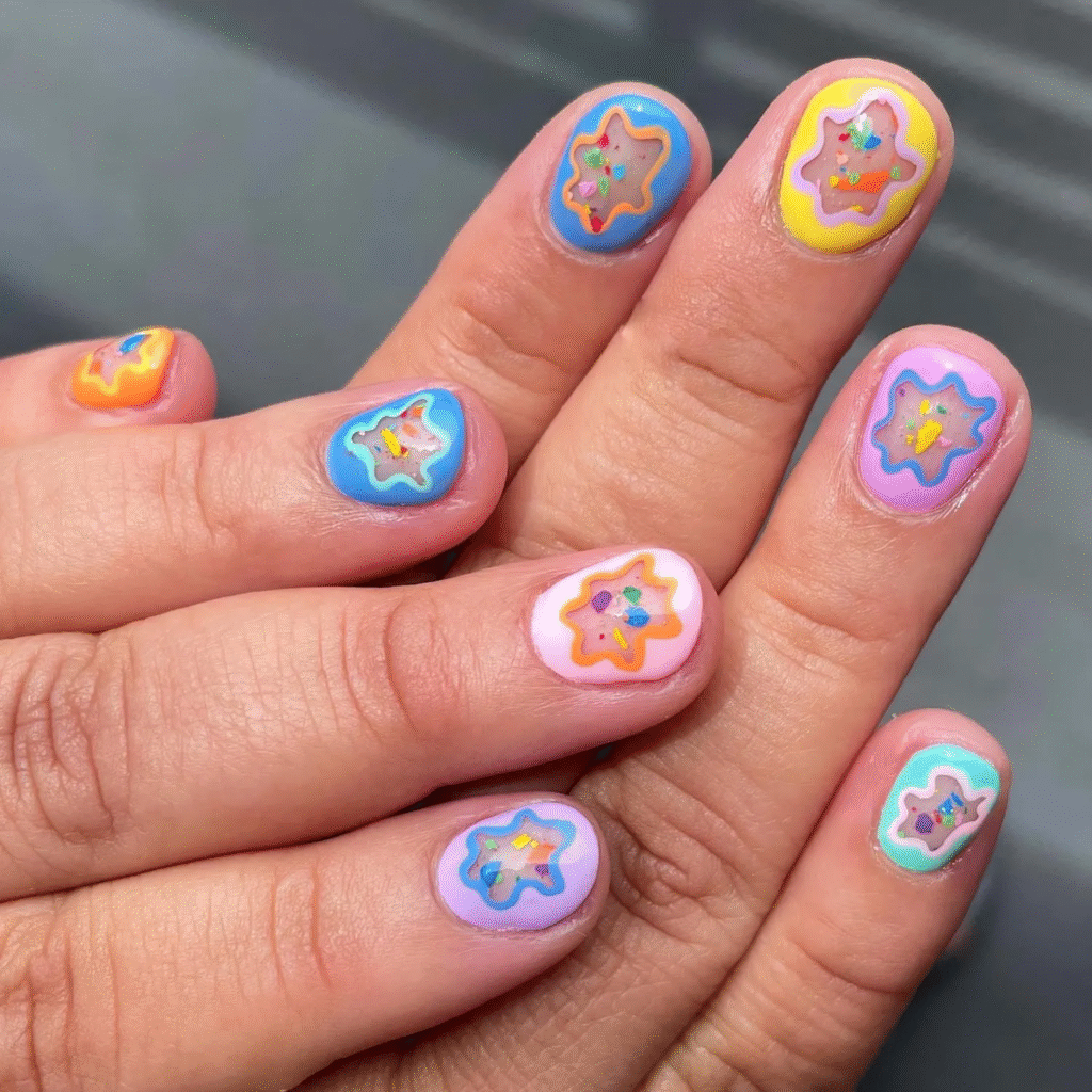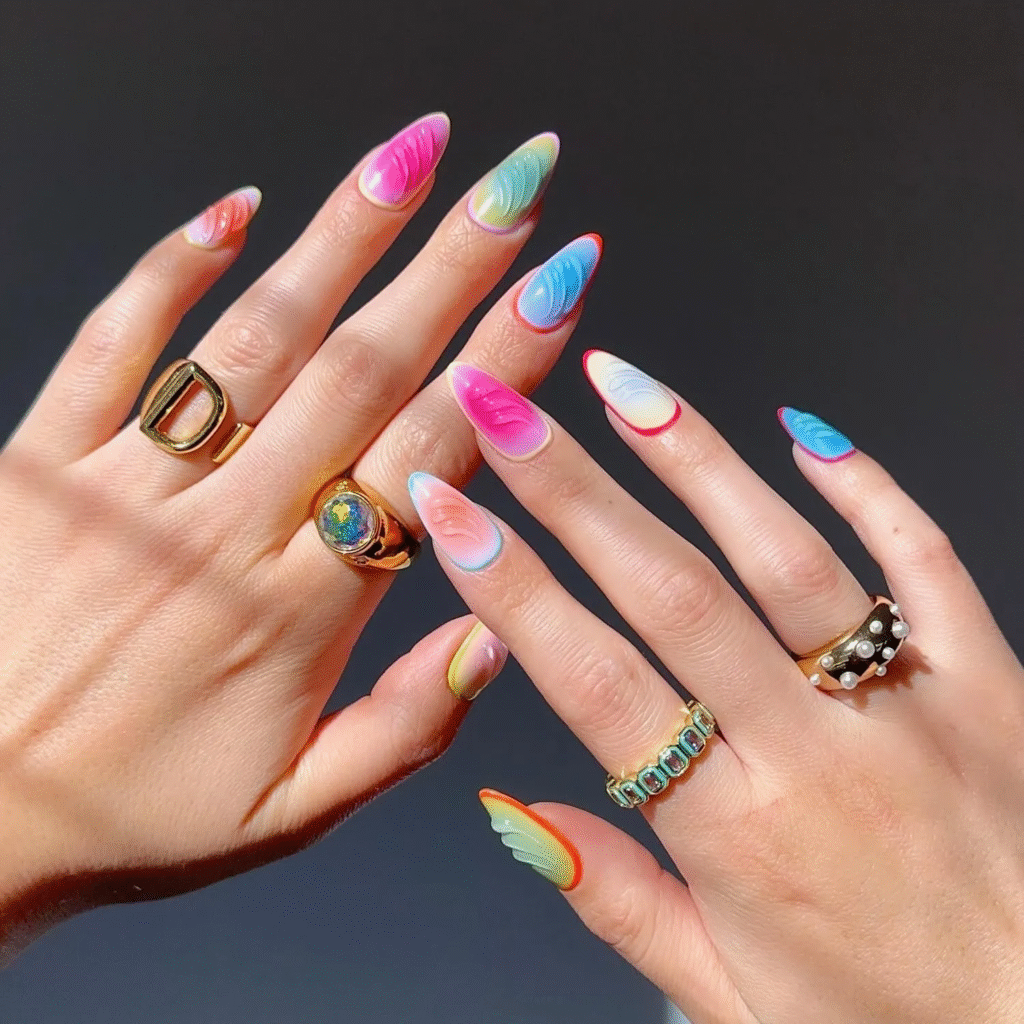 This set gives you major aura points! With a colorful, airbrushed base, the thin frames and structured gel accents make the nails feel lively and fresh. If you love colorful nails, this is a perfect choice.