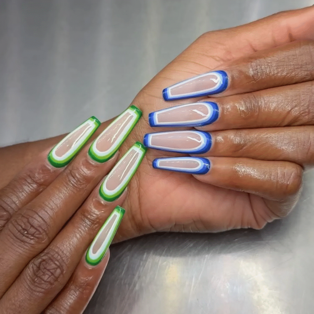 For those who like bold and fun designs, these nail frames are for you. The base is a clear nude, but the blue and green frames steal the show. Thin white lines help the frames stand out even more.