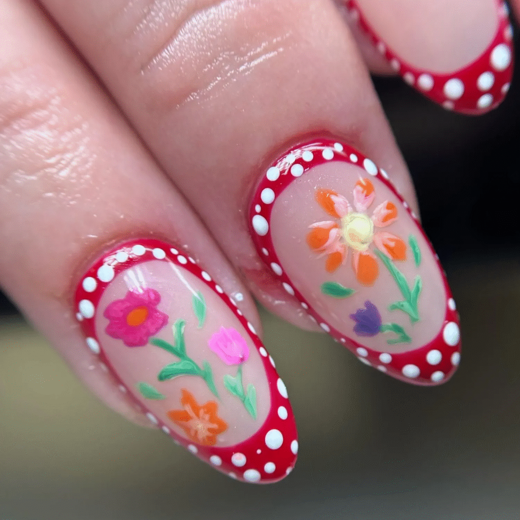 This manicure screams summer! The bright red frames are dotted with white polka dots, and the floral centerpiece adds a fresh touch. It’s a happy and playful design that’s perfect for warm weather.