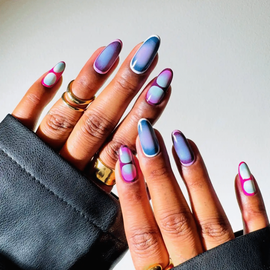 Berry colors are in, and this airbrush design takes them to a whole new level. The nails are framed in berry shades and feature soft airbrush details in blue, purple, and pink. It’s vibrant, fun, and definitely eye-catching.