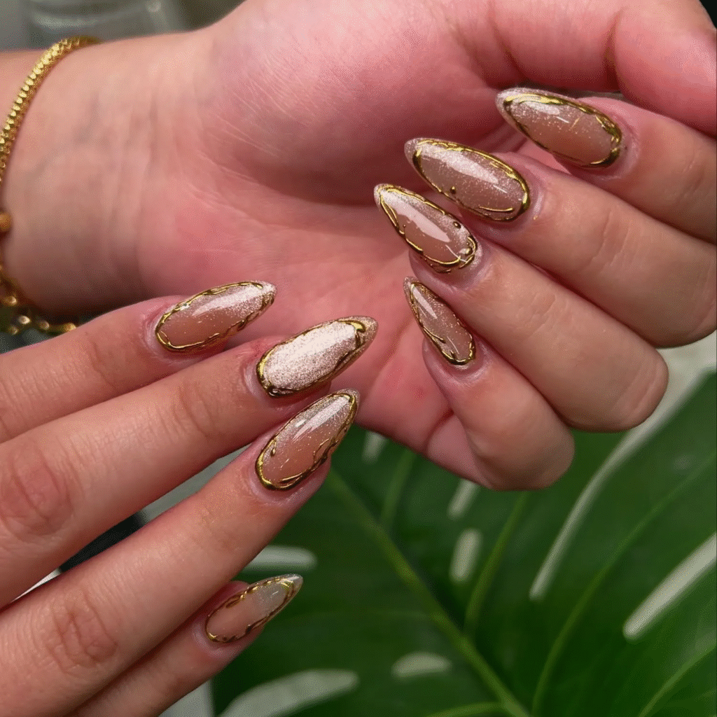 This design is the perfect blend of soft and luxurious. The dusty pink velvet nails are complemented by sleek, abstract gold chrome frames. It’s a simple yet sophisticated look that works well for elegant occasions.