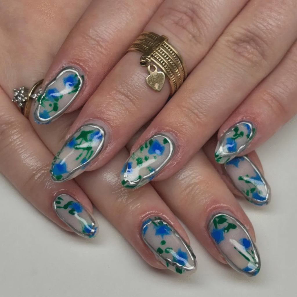 If you love a more delicate design, this one’s for you. The soft nude base pairs beautifully with watercolor-inspired floral details. The chrome frame surrounding the design adds an elegant finish.