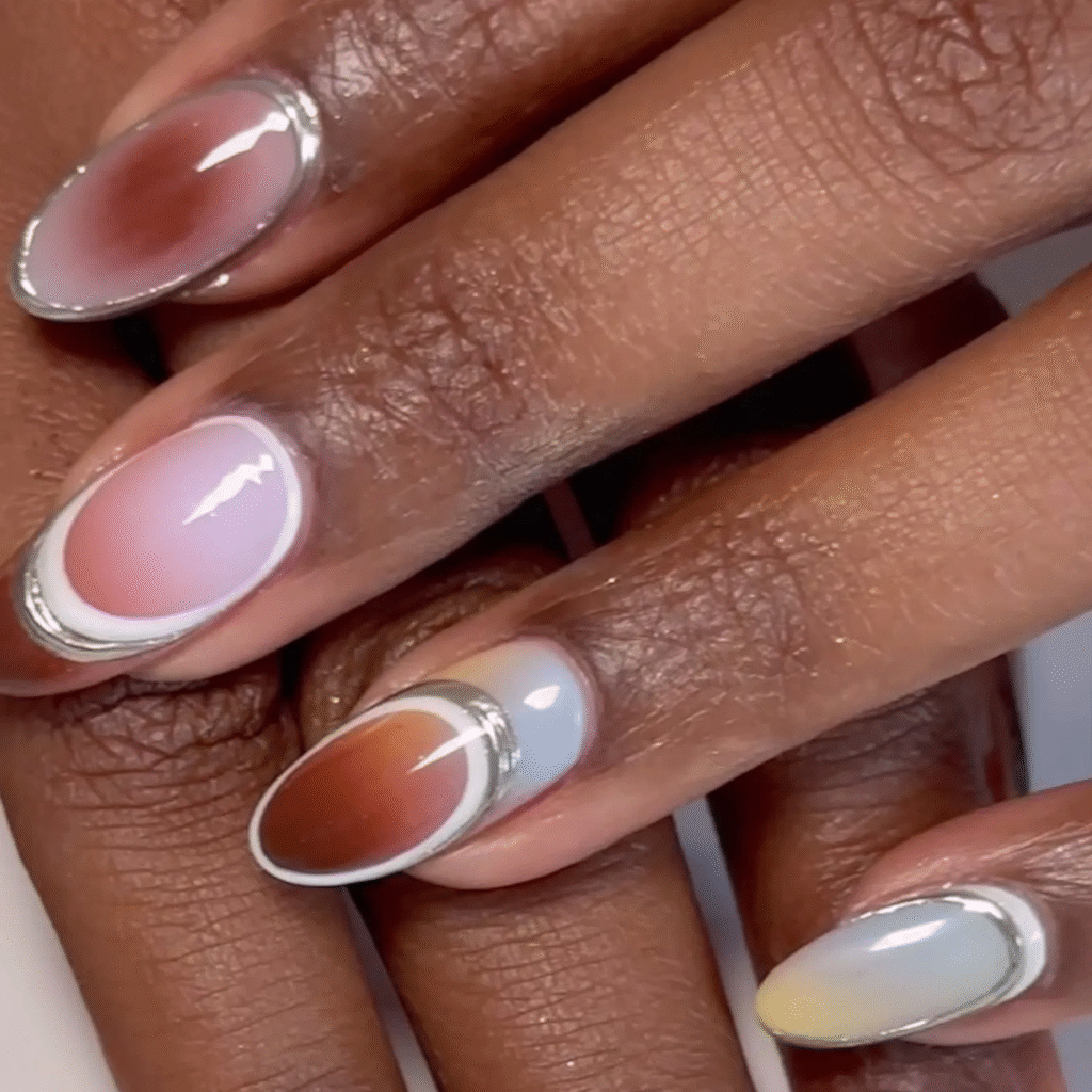 This abstract design mixes chrome and white frames in unique half-and-full patterns. The airbrush technique on nude and pastel nails brings out the creativity, making this look perfect for anyone who loves a modern, abstract style.
