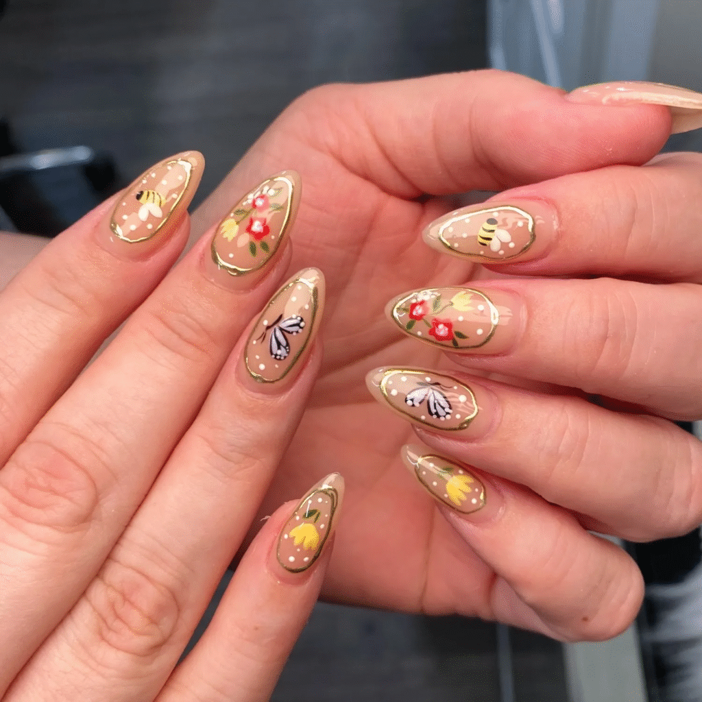 Nature lovers will adore this design. The nude base is decorated with tiny butterflies, bees, and flowers. Thin gold frames tie everything together for a dainty and beautiful look.