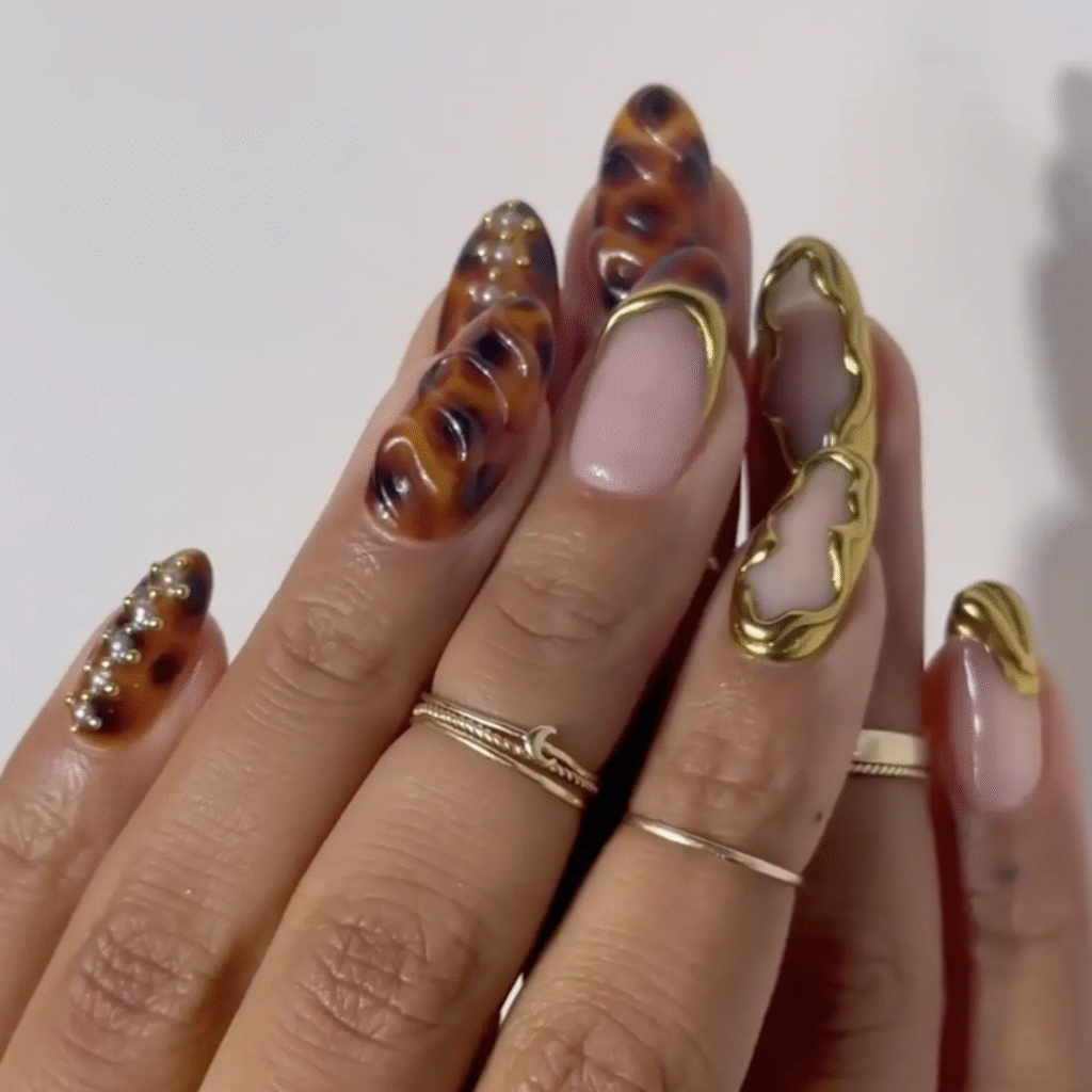 Sometimes it’s the little things that make a design stand out. This set combines leopard print, tortoiseshell accents, and chrome gold frames. It also features small pearls and intricate details that make each nail unique.