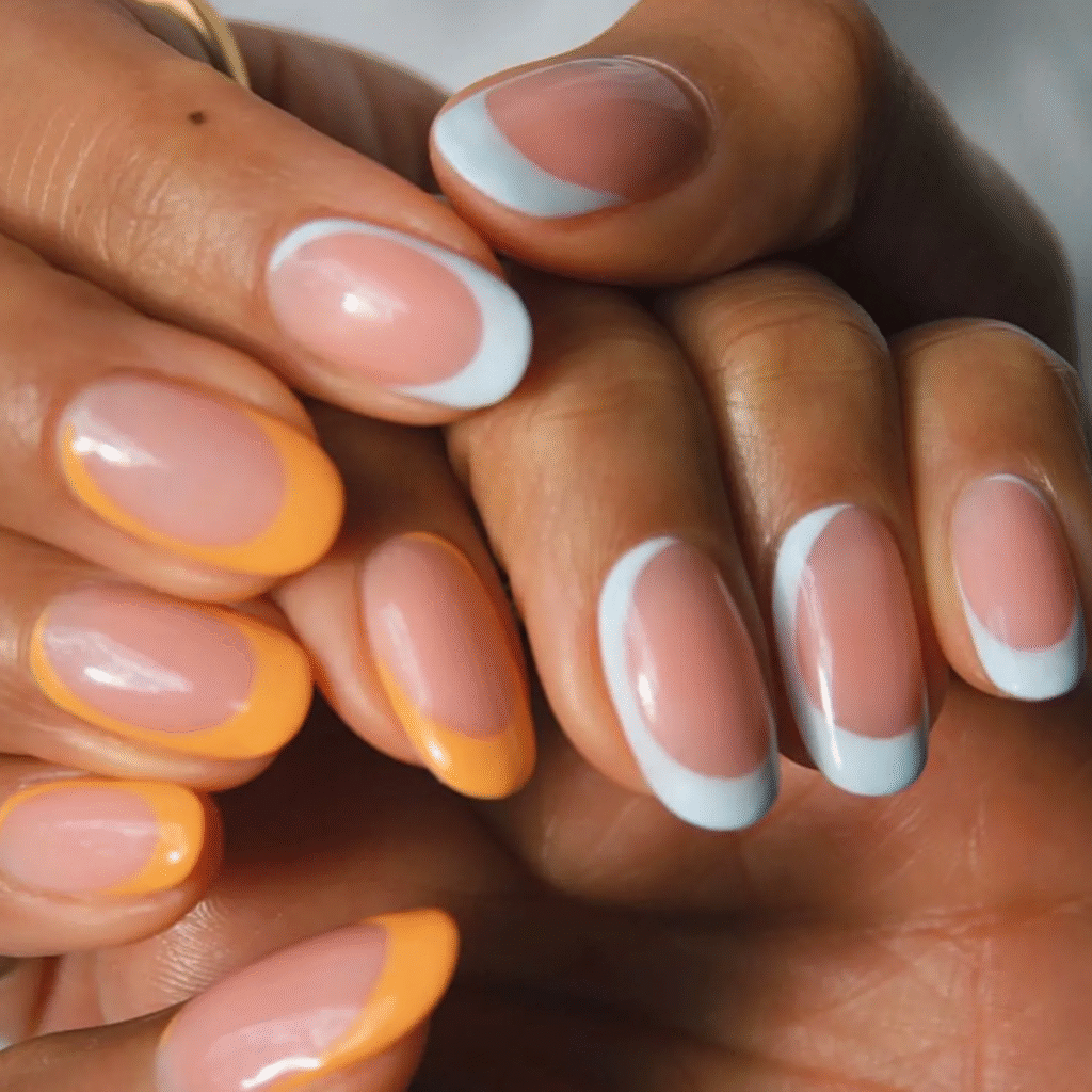 Sometimes a simple frame is all you need to make a statement. These retro-style frames in orange and powder blue look fantastic on a clear base. It’s a minimalist approach to the framed nail trend that’s still full of personality.