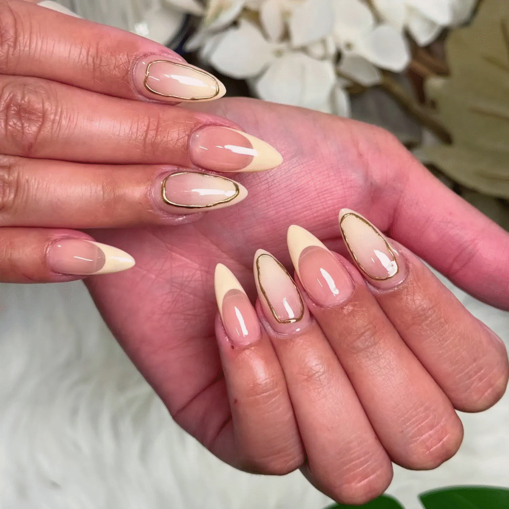 Butter yellow is the perfect color for nails this season, and it pairs perfectly with gold chrome. This design features French tips and ombré nails with gold framing details. It’s a simple yet stunning look that’s perfect for any occasion.