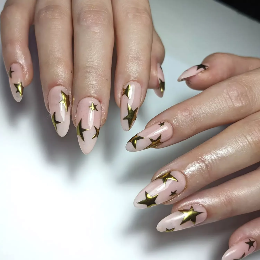 Everyone deserves a gold star in January. A nude base keeps things simple. Gold stars add a happy and hopeful feel to your nails.