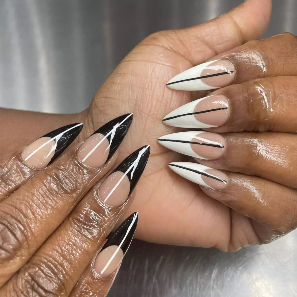 This is a bold twist on the classic French style. Black tips replace white, giving a sharp look. Small silver studs add edge but still keep it simple.