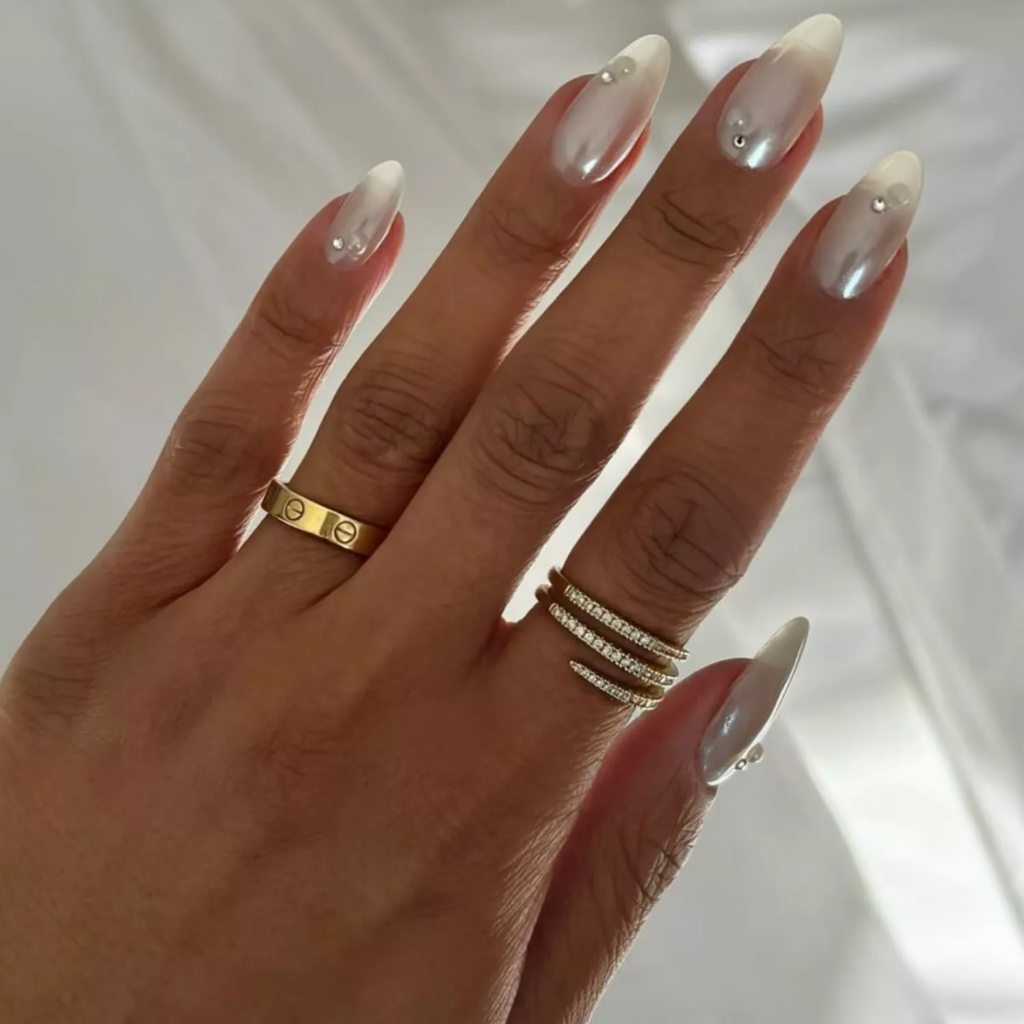 This style feels fancy but is easy to do. White polish and chrome powder create a pearl look. Add small pearls or stones for extra charm.