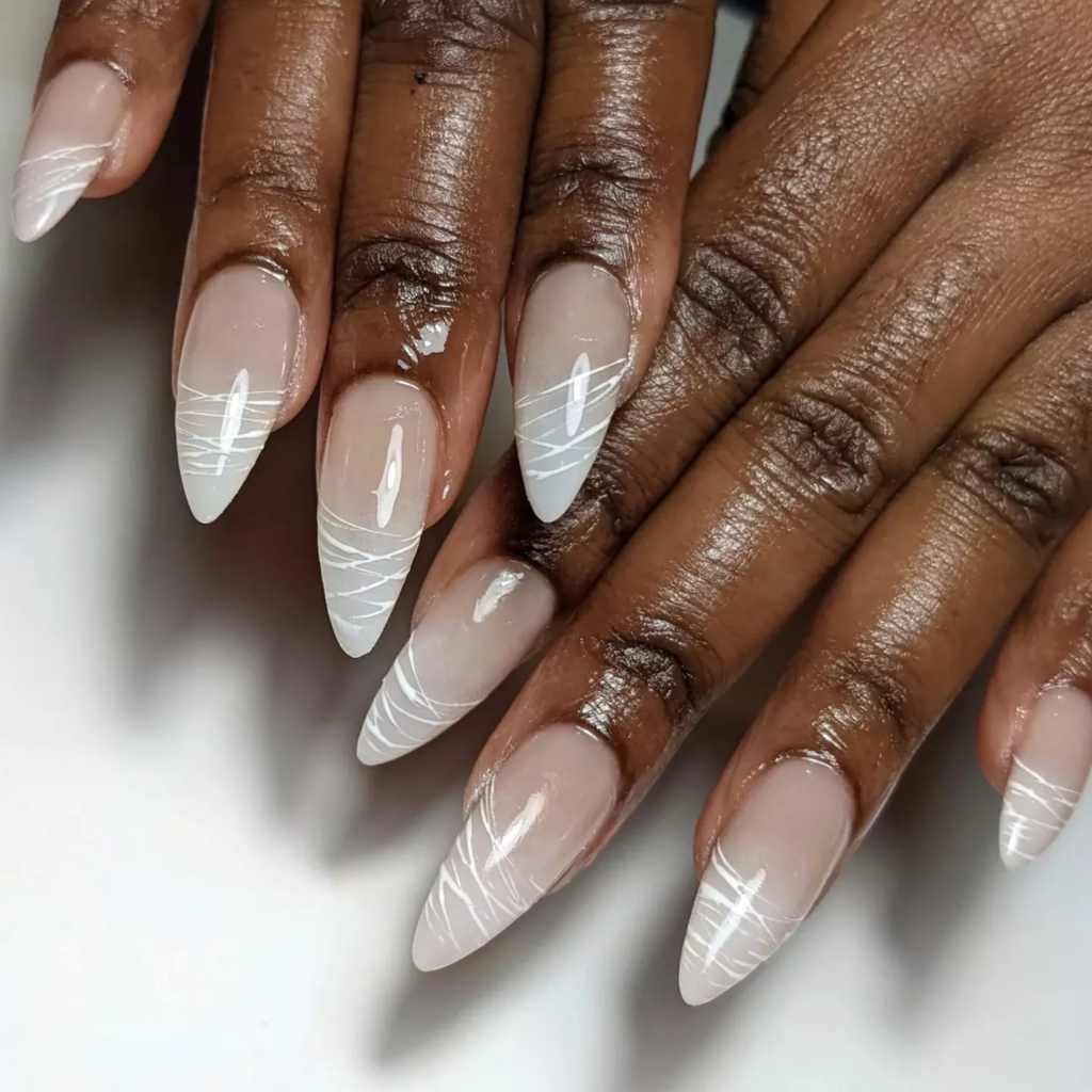 This look feels calm but rich at the same time. A milky nude base keeps things soft and clean. Thin gold tips add a quiet shine without feeling too much.