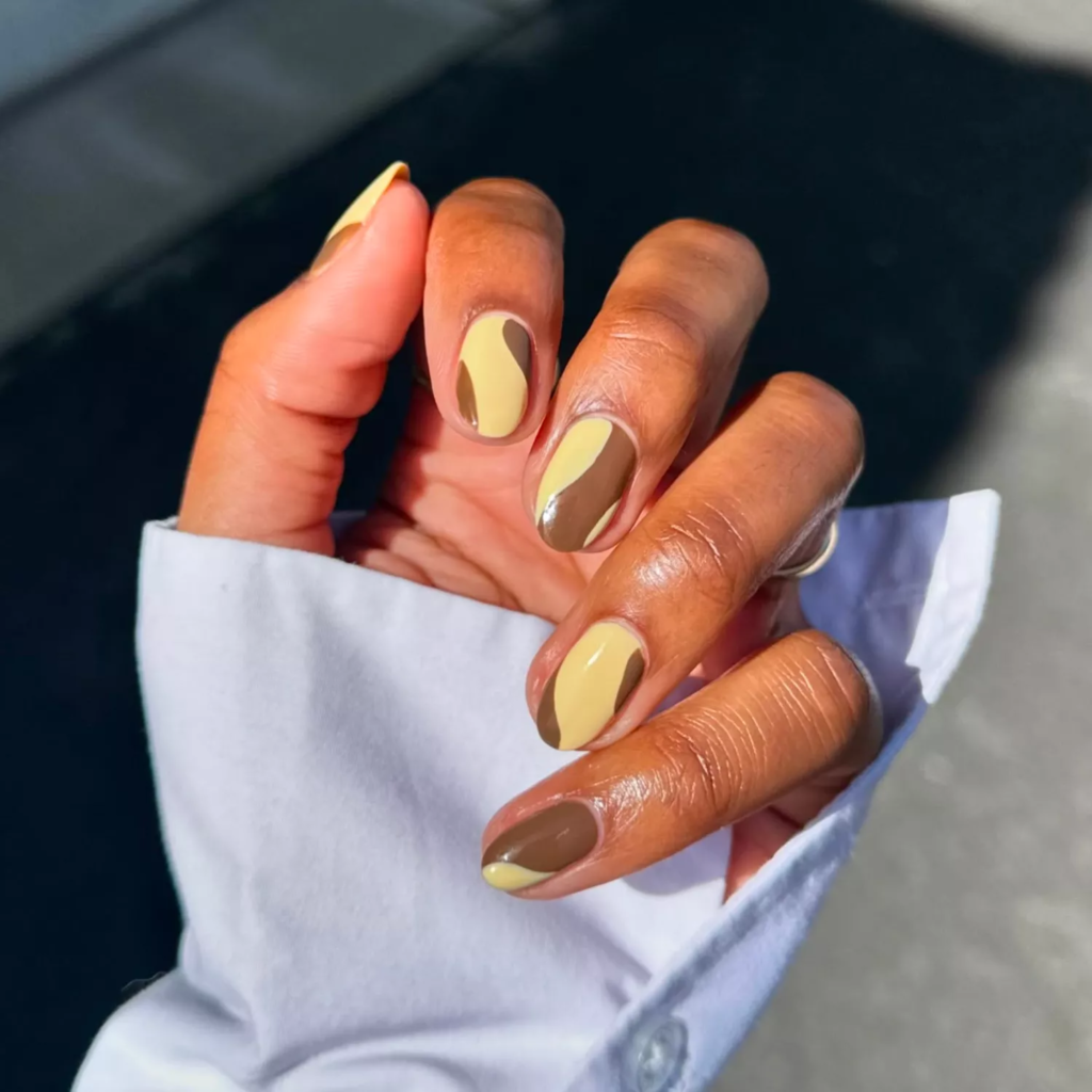 This color mix feels warm and cozy. Brown keeps it neutral, while butter yellow adds a soft glow. Swirls make the look interesting but still calm.