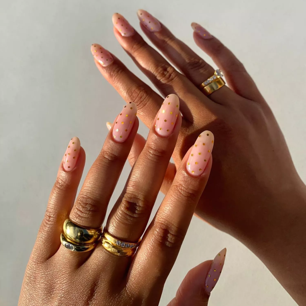 Polka dots are always happy and easy. Start with a sheer pink base for a clean look. Add tiny gold dots for a soft New Year shine.
