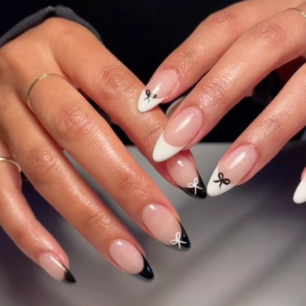 Bows make nails feel cute and fun. Paint white tips on one hand and black on the other. Add tiny bows using the opposite color or simple nail stickers.