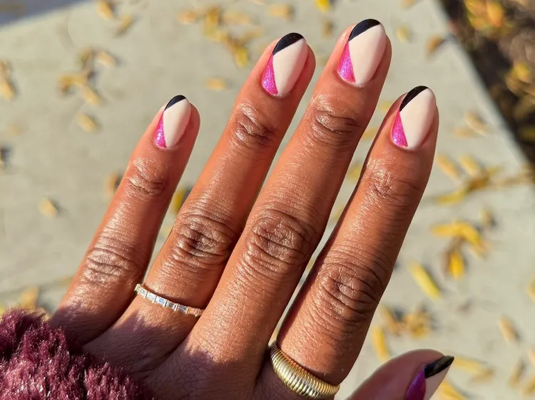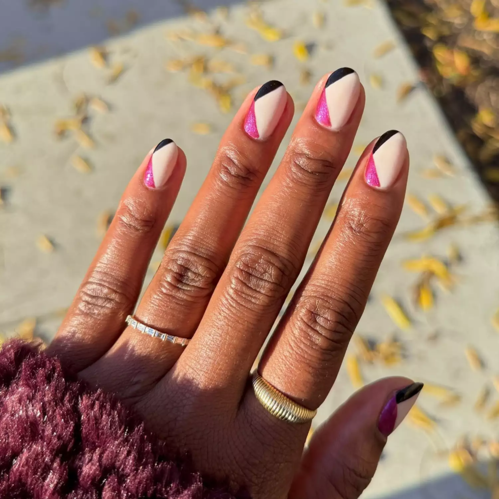 Black and white feel perfect for a fresh year. Paint black tips on one hand and white on the other. Draw a straight line down the center for a clean look.