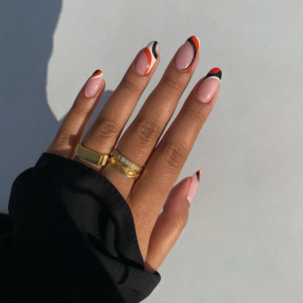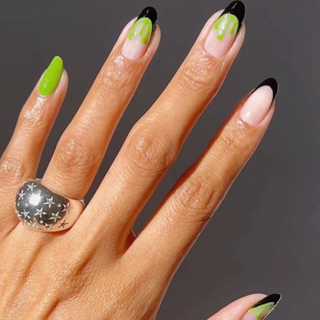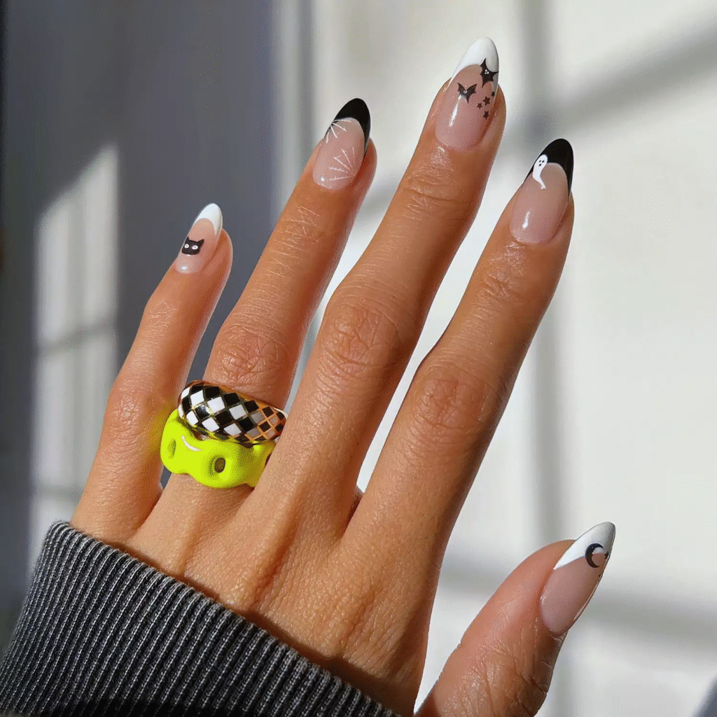 Switch up the traditional French tips with Halloween’s iconic colors: orange and black. You can alternate the tips between the two colors for a bold, festive look.