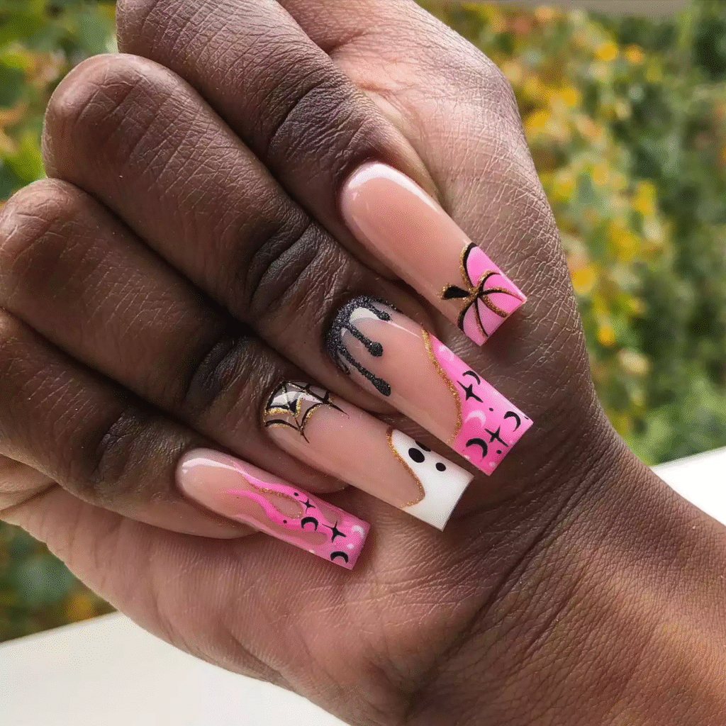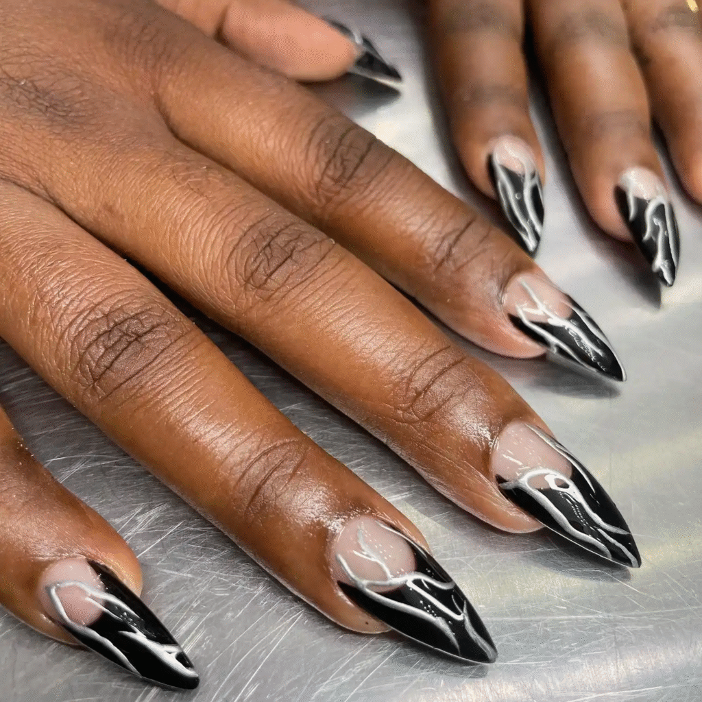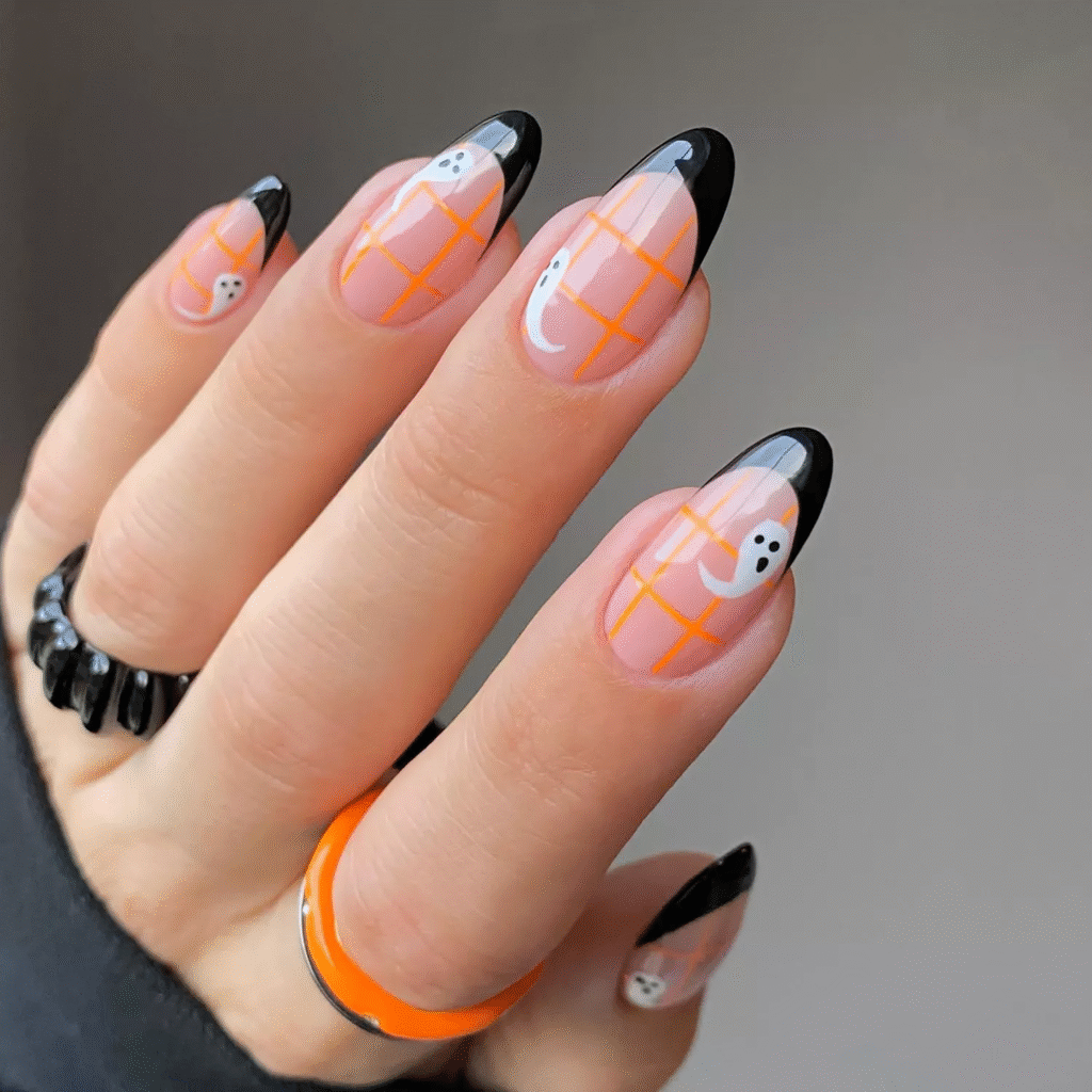 Switch up the traditional French tips with Halloween’s iconic colors: orange and black. You can alternate the tips between the two colors for a bold, festive look.