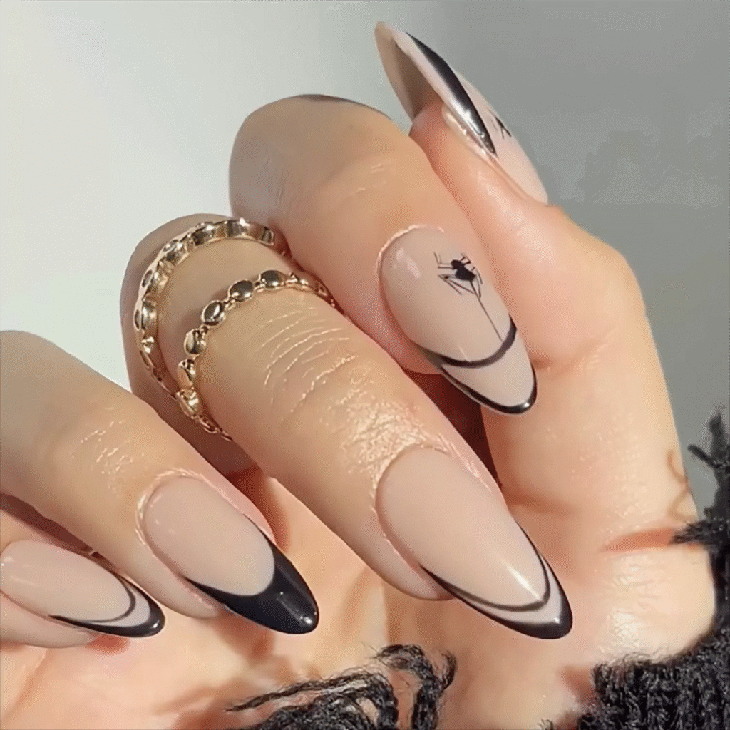 For a fuller spooky design, try painting a small spider on your nails with a web design coming from the tips. It’s an intricate, eye-catching design that brings Halloween energy to your nails.