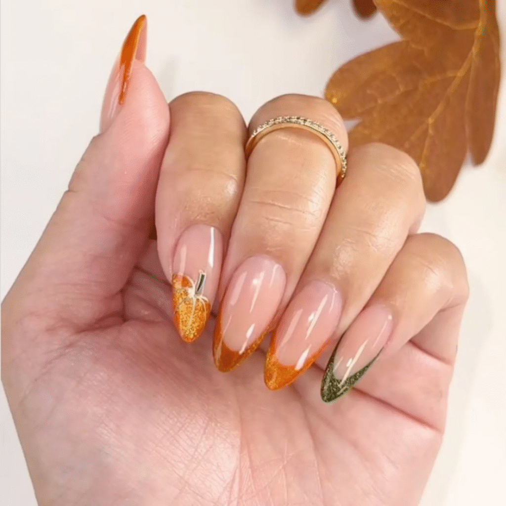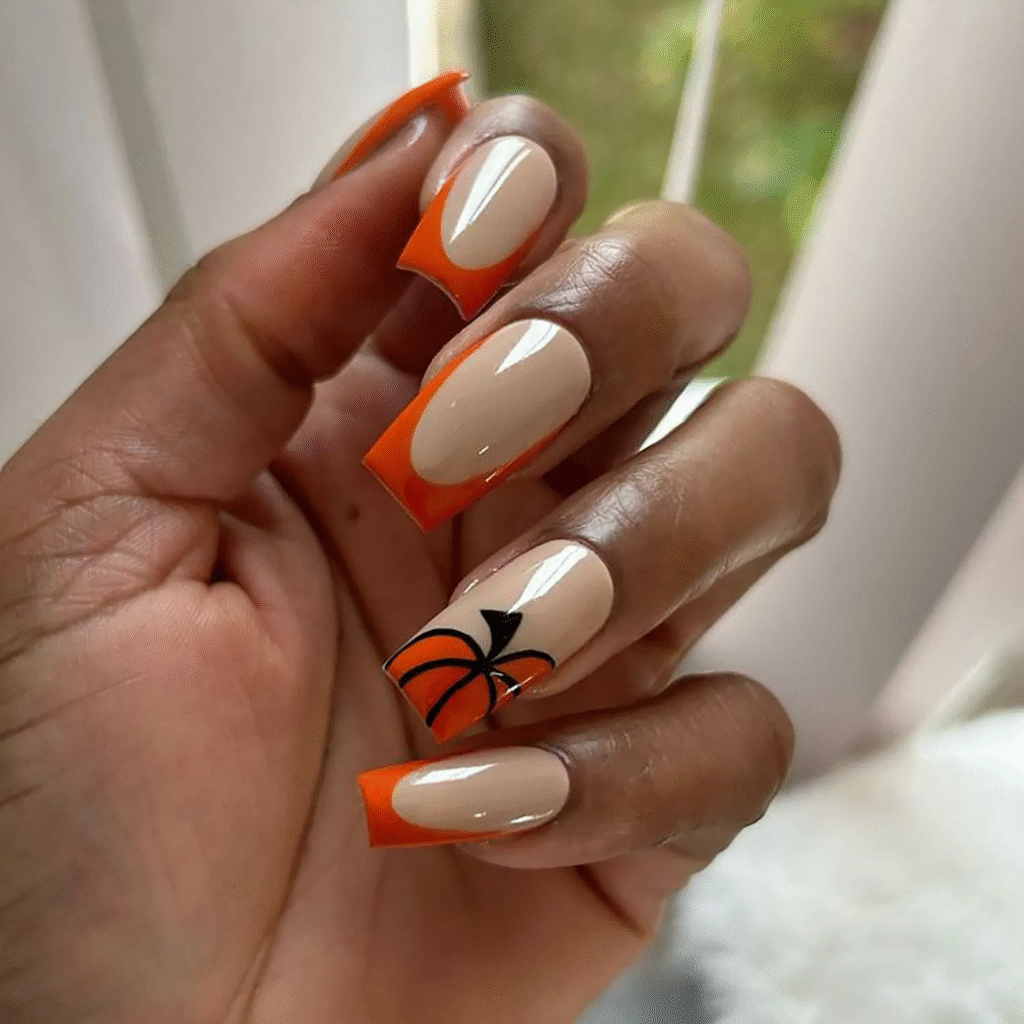 Tiny pumpkin designs at the tips of your nails add a playful Halloween touch. You can keep the base of your nails natural and paint cute little pumpkins at the tips to make them pop.