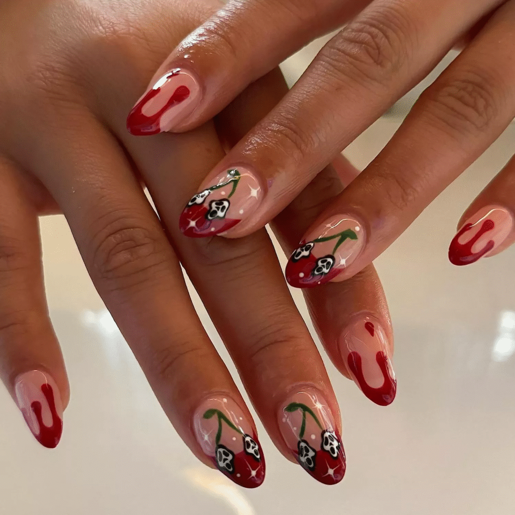 For a creepy, horror movie-inspired design, you can create tiny bloody handprints at the tips of your nails. It’s spooky and gives off that classic Halloween horror vibe.