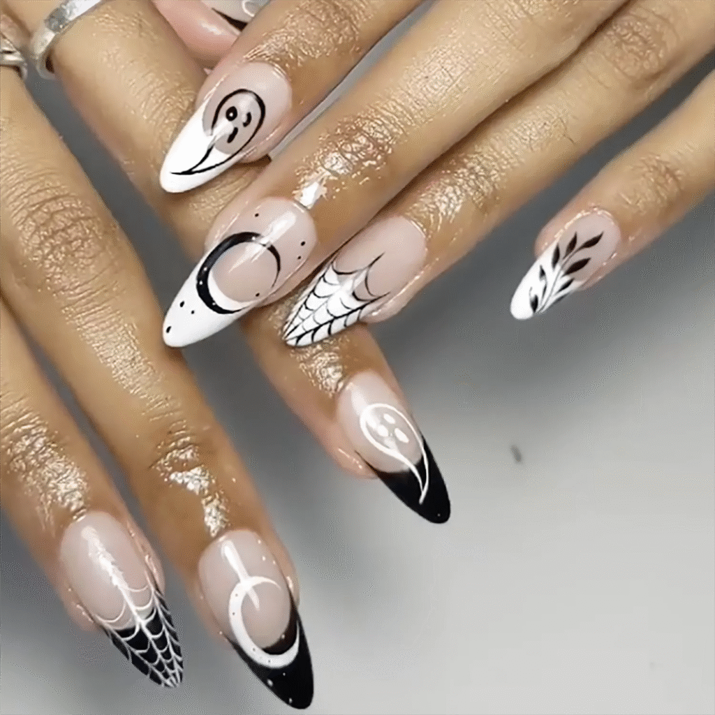 How about tiny ghost faces on your nails? You can paint a ghost on the base of your nail or at the tips. They’re adorable but spooky, perfect for the season.