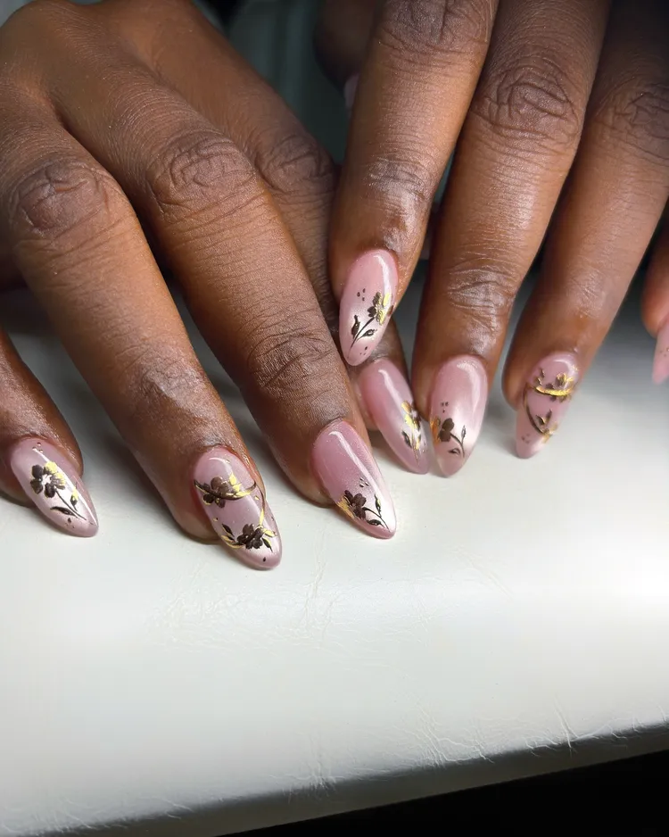 Flower designs are timeless, but when you add chrome, they get an extra pop. These pink cat-eye nails with bronze chrome flowers are delicate, feminine, and luxurious. It’s like wearing jewelry on your nails.