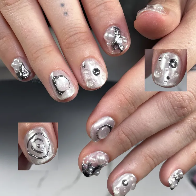 Inspired by the sea, these 3D pearlescent nails are a unique combination of chrome and pearls. The oyster-inspired design is one-of-a-kind and adds a soft, luxurious feel to your manicure.
