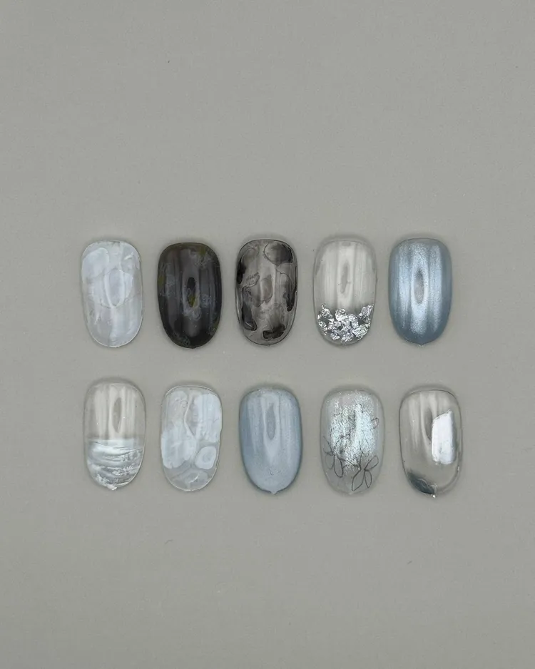 Celebrate the end of summer with these silver chrome nails featuring 3D droplets and swirls. The design is perfect for those who want to carry a bit of summer rain into fall, combining dewy metallic textures with soft chrome designs.