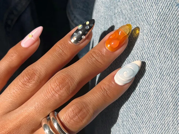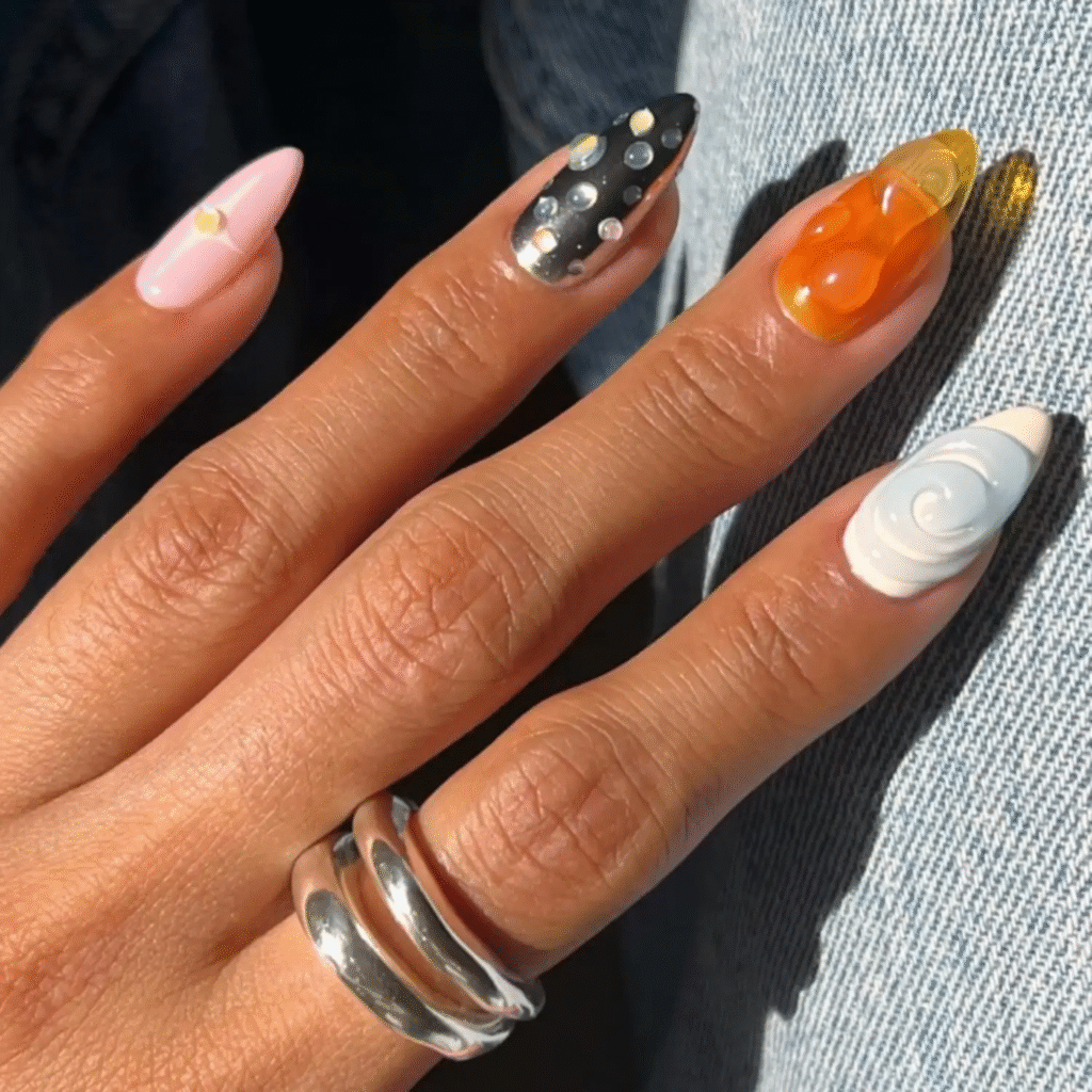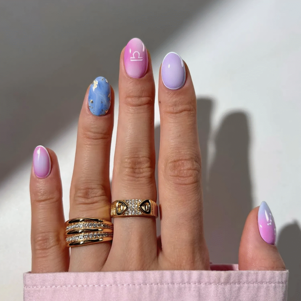 For a creative and artsy look, try mismatched nails. You can combine baby pink, dewdrop silver chrome, jammy peach, and airy swirls. This unique design creates a cohesive yet playful Libra-inspired manicure.
