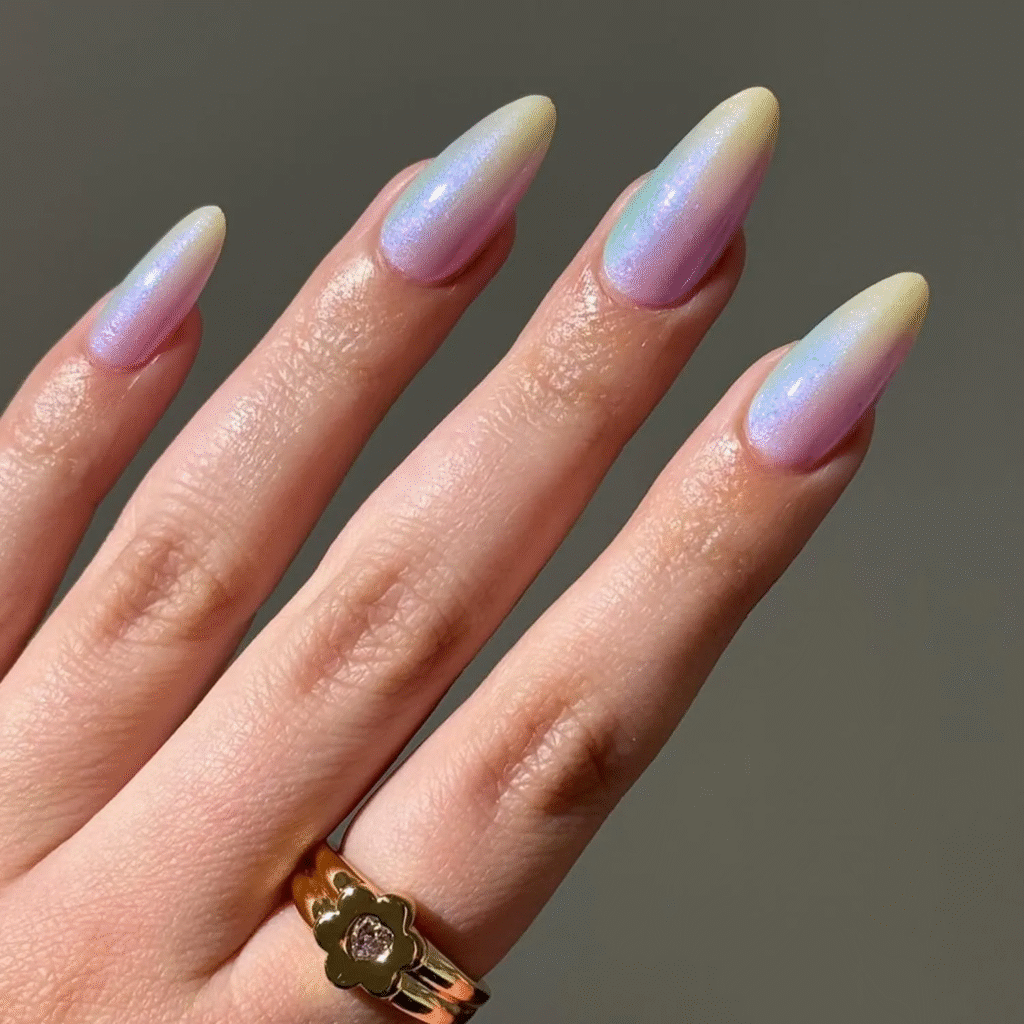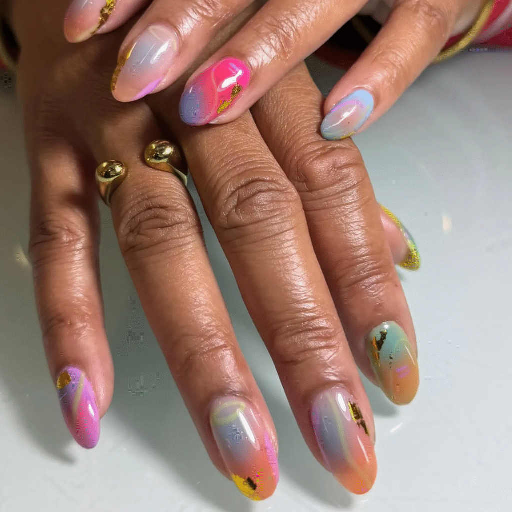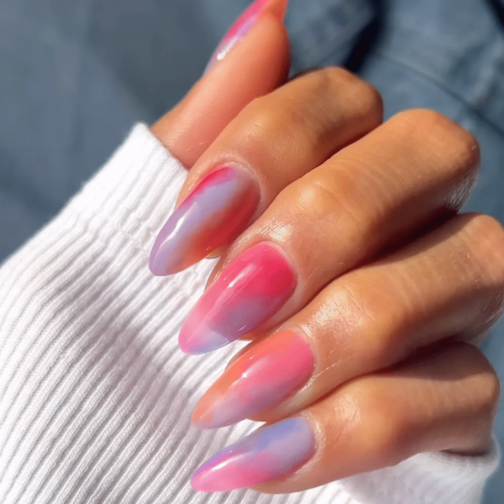 This design is all about soft, pastel hues with a dreamy cotton candy sunset look. With sheer pink, peach, and purple blooming gels, you can create this gorgeous design with ease. If you’re feeling creative, try doing it yourself with regular sheer polishes and a nail sponge.