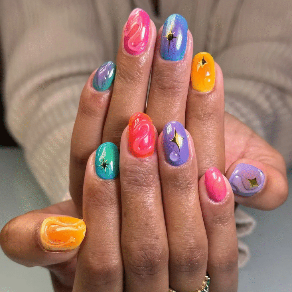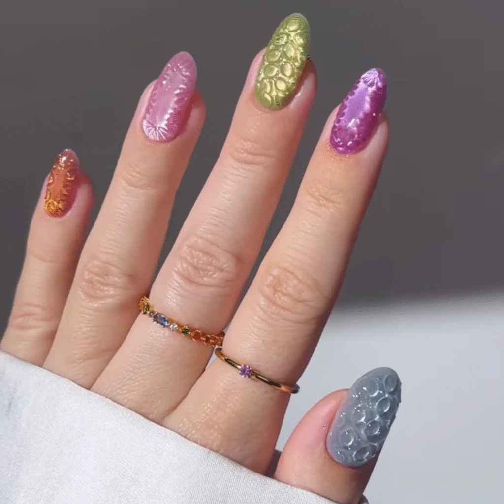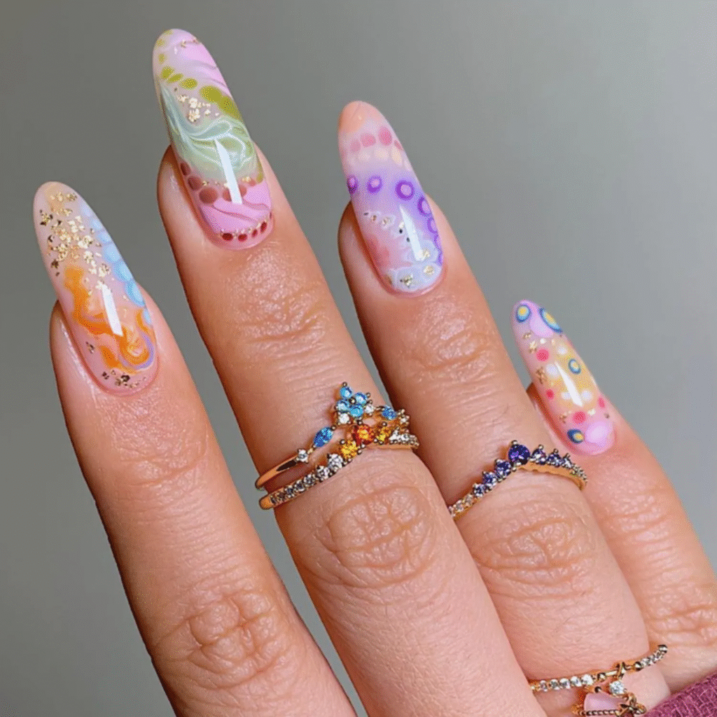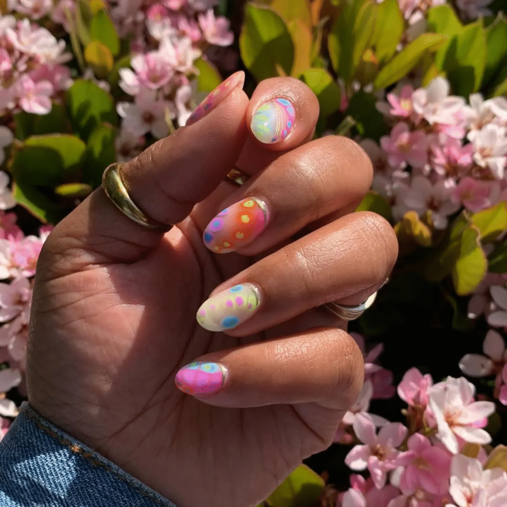 For an easy yet stunning design, try a blooming gel manicure. These colorful layered nails are easy to create at home, and the natural spreading of the polish makes them look intricate with minimal effort.