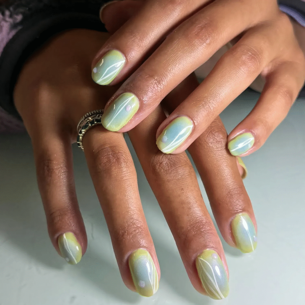 For a fresh and airy look, go for pastel lime and aqua aura nails. Start with a pale lime base, then sponge a light blue polish over it. Add a few white splotches for a dreamy, airy effect.