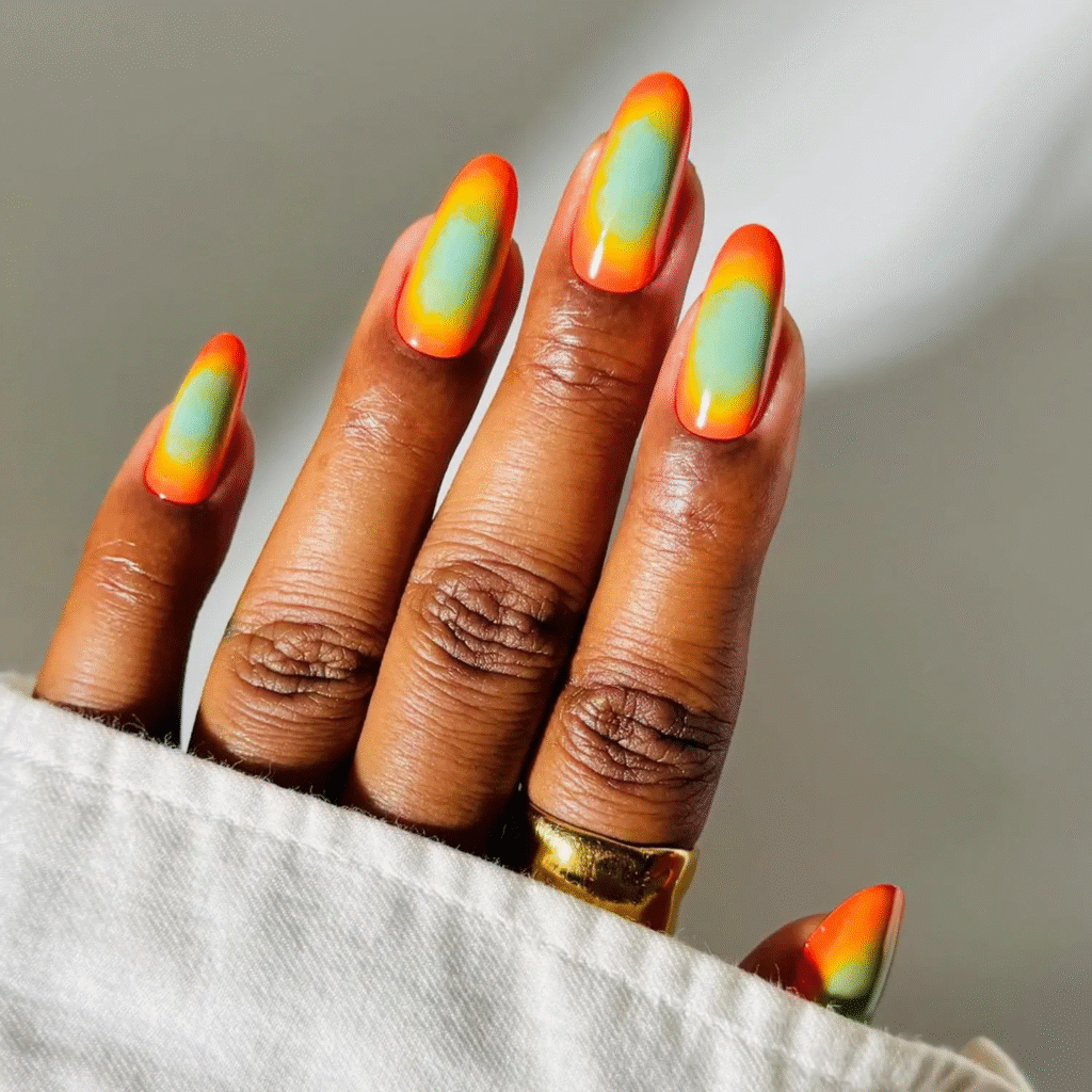 Libra season isn’t all about soft shades. For a more vibrant look, consider a sunrise aura design with peach, marigold, and mint polishes. This bold design will surely make your nails stand out.