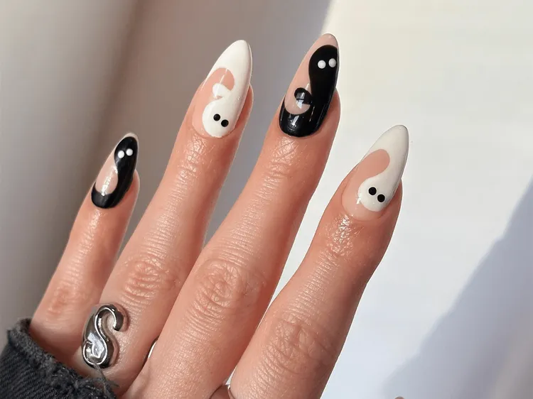 If you can’t decide on just one Halloween motif, why not use them all? A black-and-white base with different Halloween icons like ghosts, spiders, cats, and mummies will make your nails stand out. This design is quirky and fun, perfect for Halloween.