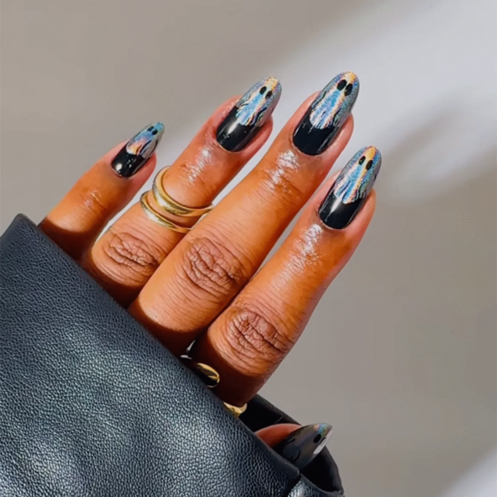 Want to add some sparkle to your spooky nails? Holographic foil ghosts are a great choice. These ghost designs are easy to create with foil nail wraps, especially on a rich black polish. The contrast between the holographic design and black polish makes for a stylish Halloween manicure.